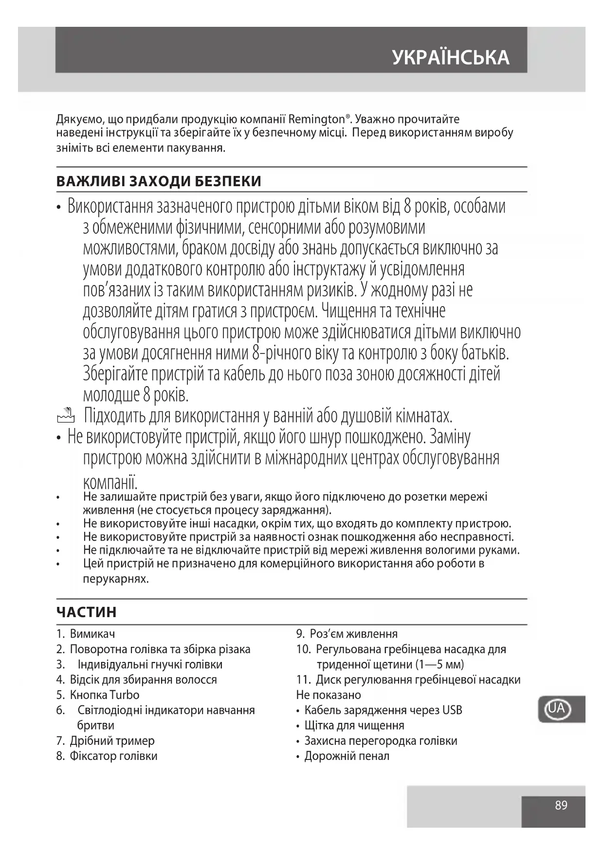 Da bi se izbegle štetne posledice na životnu sredinu i zdravlje zbog opasnih supstanci, aparati i punjive i nepunjive baterije obeleženi jednim od ovih simbola ne smeju se odlagati kao neklasifikovani urbani otpad. Uvek odložite električne i elektronske proizvode i, gde je primenljivo, punjive i nepunjive baterije, u odgovarajućem zvaničnom mestu za sakupljanje/reciklažu. SRPSKI89 Дякуємо, що придбали продукцію компанії Remington®. Уважно прочитайте наведені інструкції та зберігайте їх у безпечному місці . Перед використанням виробу зніміть всі елементи пакування. ВАЖЛИВІ ЗАХОДИ БЕЗПЕКИ