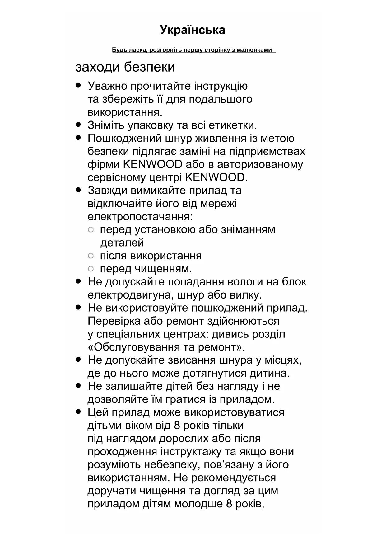 Пошкоджений шнур живлення із метою безпеки підлягає заміні на підприємствах фірми KENWOOD або в авторизованому сервісному центрі KENWOOD.