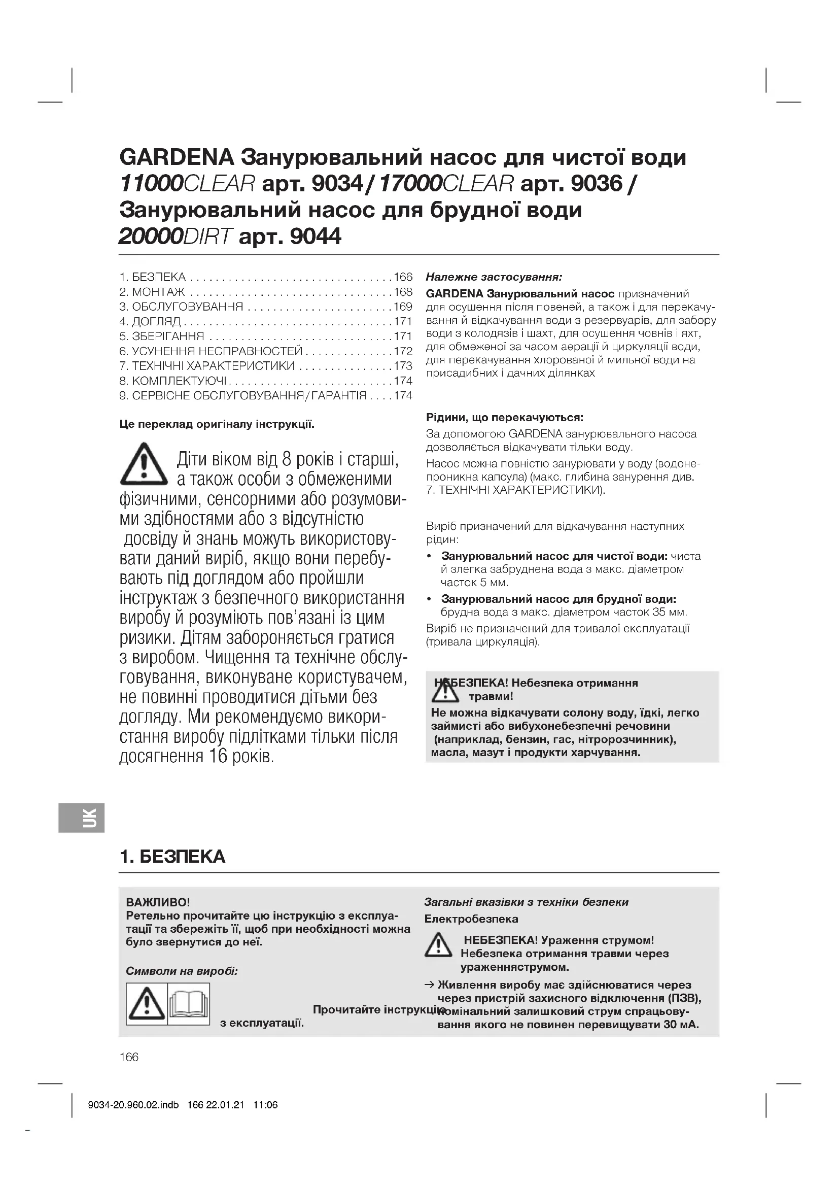 9034-20.960.02.indb 166 22.01.21 11:06GARDENA Занурювальний насос для чистої води 11000CLEAR арт. 9034 / 17000CLEAR арт. 9036 / Занурювальний насос для брудної води 20000DIRT арт. 9044 v Зверніться в сервісний центр GARDENA, якщо спрацював пристрій захисного відключення (RCD). НЕБЕЗПЕКА! Небезпека отримання травм! Небезпека отримання травми через ура- ження електричним струмом. v Від’єднайте виріб від електромережі перед проведенням робіт зтехнічного обслугову- вання або заміно деталей. Відключена вилка повинна знаходитися у вашому полі зору. Безпечна експлуатація Уникайте перевищення температури води 35 °C. Не можна використовувати насос, якщо у воді знаходяться люди. Забруднення рідини може відбутися через просочу- вання змащувальних речовин. Біля води не повинні перебувати сторонні. Експлуатуйте насос тільки з кутовим перехідником. Кінець шлангу повинен розташовуватися нижче максимальної висоти нагнітання. Захисний вимикач Тепловий захисний вимикач: При перевантаженні насос відключиться через вбудований термозахист мотора. Після достатнього охолодження мотора насос знову готовий до екс-