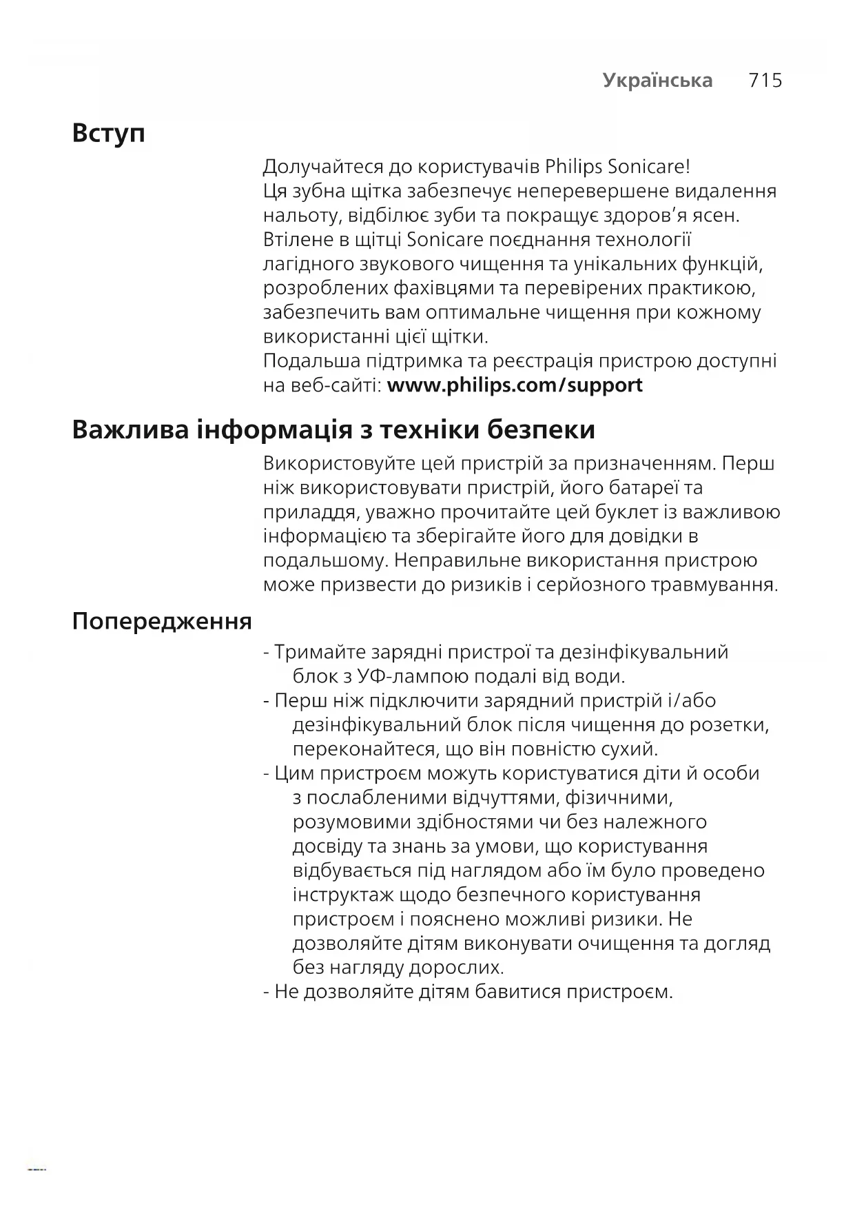 Долучайтеся до користувачів Philips Sonicare! Ця зубна щітка забезпечує неперевершене видалення нальоту, відбілює зуби та покращує здоров’я ясен. Втілене в щітці Sonicare поєднання технології лагідного звукового чищення та унікальних функцій, розроблених фахівцями та перевірених практикою, забезпечить вам оптимальне чищення при кожному використанні цієї щітки. Подальша підтримка та реєстрація пристрою доступні на веб-сайті: www.philips.com/support Важлива інформація з техніки безпеки Використовуйте цей пристрій за призначенням. Перш ніж використовувати пристрій, його батареї та приладдя, уважно прочитайте цей буклет із важливою інформацією та зберігайте його для довідки в подальшому. Неправильне використання пристрою може призвести до ризиків і серйозного травмування. Попередження - Тримайте зарядні пристрої та дезінфікувальний блок з УФ-лампою подалі від води. - Перш ніж підключити зарядний пристрій і/або дезінфікувальний блок після чищення до розетки, переконайтеся, що він повністю сухий. - Цим пристроєм можуть користуватися діти й особи з послабленими відчуттями, фізичними, розумовими здібностями чи без належного досвіду та знань за умови, що користування відбувається під наглядом або їм було проведено інструктаж щодо безпечного користування пристроєм і пояснено можливі ризики. Не дозволяйте дітям виконувати очищення та догляд без нагляду дорослих. - Не дозволяйте дітям бавитися пристроєм.716
