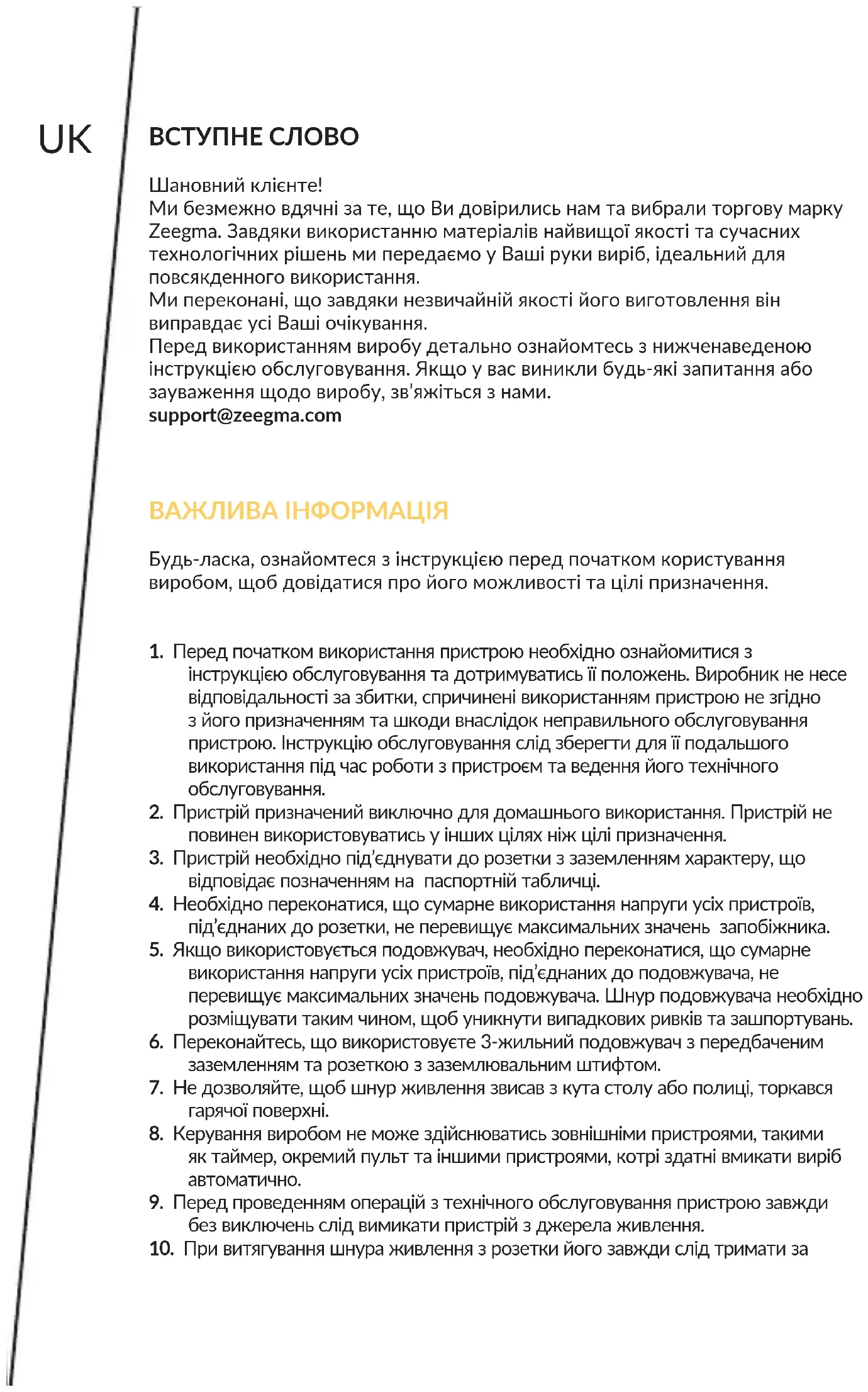 gemaakt. De aeeldingen dienen alleen ter illustrae, het werkelijke uiterlijk van de producten kan van het uiterlijk op de aeeldingen verschillen.UK ВСТУПНЕ СЛОВО Шановний клієнте! Ми безмежно вдячні за те, що Ви довірились нам та вибрали торгову марку Zeegma. Завдяки використанню матеріалів найвищої якості та сучасних технологічних рішень ми передаємо у Ваші руки виріб, ідеальний для повсякденного використання. Ми переконані, що завдяки незвичайній якості його виготовлення він виправдає усі Ваші очікування. Перед використанням виробу детально ознайомтесь з нижченаведеною інструкцією обслуговування. Якщо у вас виникли будь-які запитання або зауваження щодо виробу, зв’яжіться з нами. support@zeegma.com ВАЖЛИВА ІНФОРМАЦІЯ Будь-ласка, ознайомтеся з інструкцією перед початком користування виробом, щоб довідатися про його можливості та цілі призначення.