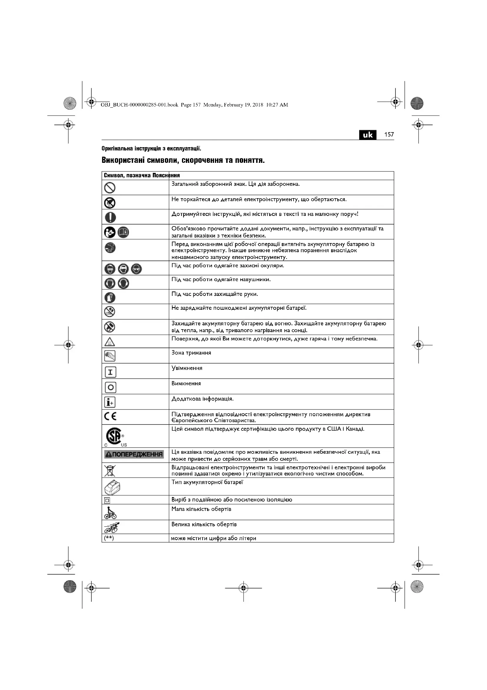 Оригінальна інструкція з експлуатації. Використані символи, скорочення та поняття. Символ, позначка Пояснення Загальний заборонний знак. Ця дія заборонена. Не торкайтеся до деталей електроінструменту, що обертаються. Дотримуйтеся інструкцій, які містяться в тексті та на малюнку поруч! Обов’язково прочитайте додані документи, напр., інструкцію з експлуатації та загальні вказівки з техніки безпеки. Перед виконанням цієї робочої операції витягніть акумуляторну батарею із електроінструменту. Інакше виникне небезпека поранення внаслідок ненавмисного запуску електроінструменту. Під час роботи одягайте захисні окуляри. Під час роботи одягайте навушники. Під час роботи захищайте руки. Не заряджайте пошкоджені акумуляторні батареї. Захищайте акумуляторну батарею від вогню. Захищайте акумуляторну батарею від тепла, напр., від тривалого нагрівання на сонці. Поверхня, до якої Ви можете доторкнутися, дуже гаряча і тому небезпечна. Зона тримання