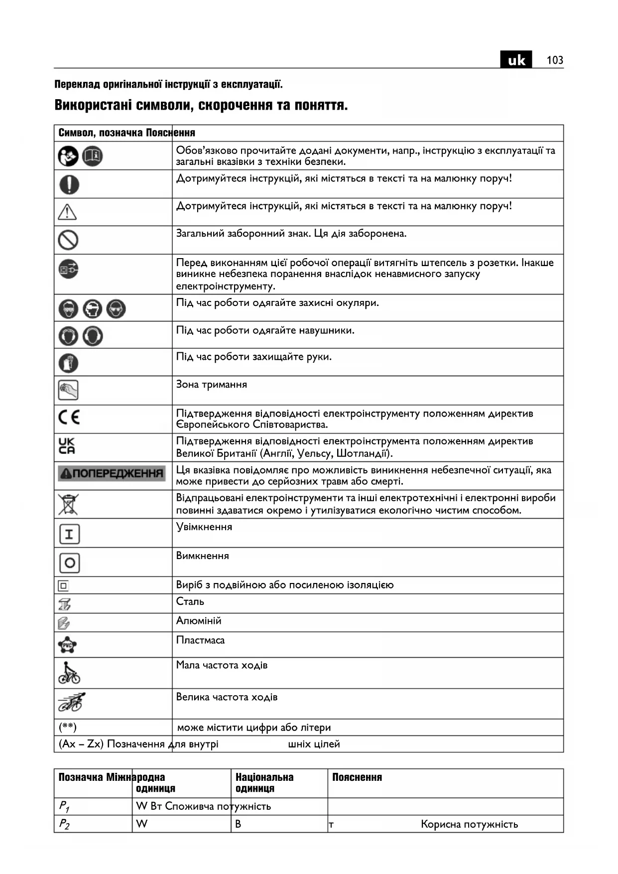 Переклад оригінальної інструкції з експлуатації. Використані символи, скорочення та поняття. Символ, позначка Пояснення Обов’язково прочитайте додані документи, напр., інструкцію з експлуатації та загальні вказівки з техніки безпеки. Дотримуйтеся інструкцій, які містяться в тексті та на малюнку поруч! Дотримуйтеся інструкцій, які містяться в тексті та на малюнку поруч! Загальний заборонний знак. Ця дія заборонена. Перед виконанням цієї робочої операції витягніть штепсель з розетки. Інакше виникне небезпека поранення внаслідок ненавмисного запуску електроінструменту. Під час роботи одягайте захисні окуляри. Під час роботи одягайте навушники. Під час роботи захищайте руки. Зона тримання Підтвердження відповідності електроінструменту положенням директив Європейського Співтовариства. Підтвердження відповідності електро інструмента положенням директив Великої Британії (Англії, Уельсу, Шотландії). Ця вказівка повідомляє про можливість виникнення небезпечної ситуації, яка може привести до серйозних травм або смерті. Відпрацьовані електроінструменти та інші електротехнічні і електронні вироби повинні здаватися окремо і утилізуватися екологічно чистим способом.
