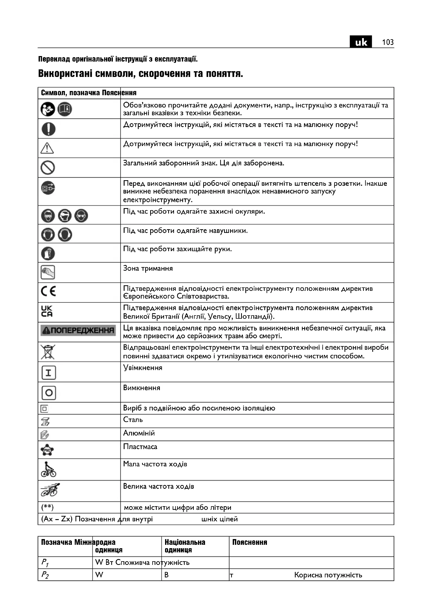 Переклад оригінальної інструкції з експлуатації. Використані символи, скорочення та поняття. Символ, позначка Пояснення Обов’язково прочитайте додані документи, напр., інструкцію з експлуатації та загальні вказівки з техніки безпеки. Дотримуйтеся інструкцій, які містяться в тексті та на малюнку поруч! Дотримуйтеся інструкцій, які містяться в тексті та на малюнку поруч! Загальний заборонний знак. Ця дія заборонена. Перед виконанням цієї робочої операції витягніть штепсель з розетки. Інакше виникне небезпека поранення внаслідок ненавмисного запуску електроінструменту. Під час роботи одягайте захисні окуляри. Під час роботи одягайте навушники. Під час роботи захищайте руки. Зона тримання Підтвердження відповідності електроінструменту положенням директив Європейського Співтовариства. Підтвердження відповідності електро інструмента положенням директив Великої Британії (Англії, Уельсу, Шотландії). Ця вказівка повідомляє про можливість виникнення небезпечної ситуації, яка може привести до серйозних травм або смерті. Відпрацьовані електроінструменти та інші електротехнічні і електронні вироби повинні здаватися окремо і утилізуватися екологічно чистим способом.