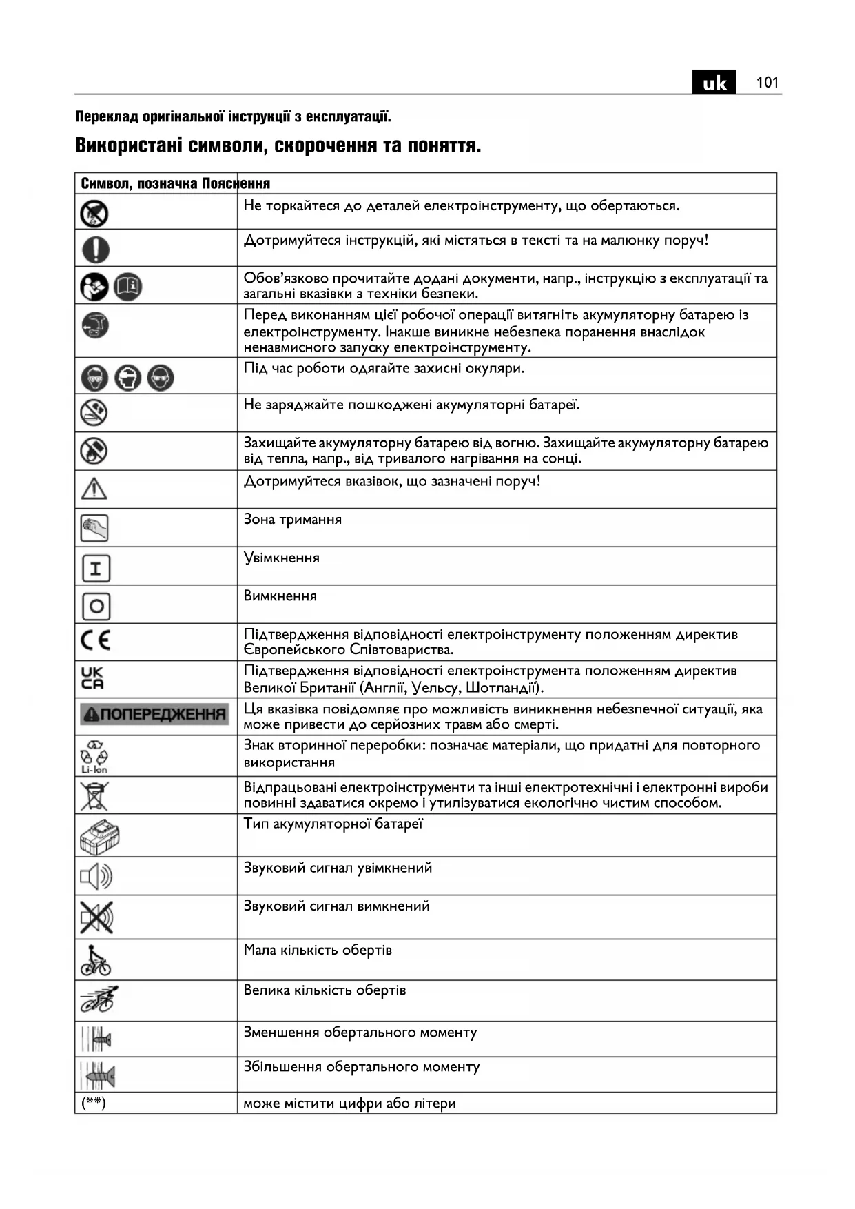 Підтвердження відповідності електроінструменту положенням директив Європейського Співтовариства. Підтвердження відповідності електроінструмента положенням директив Великої Британії (Англії, Уельсу, Шотландії). Ця вказівка повідомляє про можливість виникнення небезпечної ситуації, яка може привести до серйозних травм або смерті. Знак вторинної переробки: позначає матеріали, що придатні для повторного використання Відпрацьовані електроінструменти та інші електротехнічні і електронні вироби повинні здаватися окремо і утилізуватися екологічно чистим способом. Тип акумуляторної батареї Звуковий сигнал увімкнений Звуковий сигнал вимкнений Мала кількість обертів Велика кількість обертів Зменшення обертального моменту Збільшення обертального моменту (**) може містити цифри або літери102