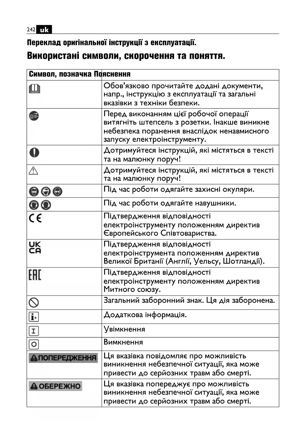 Переклад оригінальної інструкції з експлуатації. Використані символи, скорочення та поняття. Символ, позначка Пояснення Обов’язково прочитайте додані документи, напр., інструкцію з експлуатації та загальні вказівки з техніки безпеки. Перед виконанням цієї робочої операції витягніть штепсель з розетки. Інакше виникне небезпека поранення внаслідок ненавмисного запуску електроінструменту. Дотримуйтеся інструкцій, які містяться в тексті та на малюнку поруч! Дотримуйтеся інструкцій, які містяться в тексті та на малюнку поруч! Під час роботи одягайте захисні окуляри. Під час роботи одягайте навушники. Підтвердження відповідності електроінструменту положенням директив Європейського Співтовариства. Підтвердження відповідності електроінструмента положенням директив Великої Британії (Англії, Уельсу, Шотландії). Підтвердження відповідності електроінструменту положенням директив Митного союзу. Загальний заборонний знак. Ця дія заборонена. Додаткова інформація.