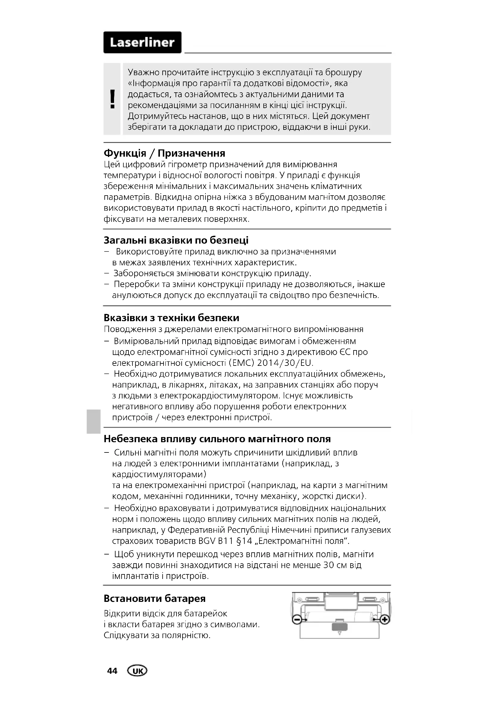 47 г (с батарея) Информация по обслуживанию и уходу Все компоненты очищать слегка влажной салфеткой; не использовать чистящие средства, абразивные материалы и растворители. Прибор хранить в чистом и сухом месте. RU44 Небезпека впливу сильного магнітного поля – Сильні магнітні поля можуть спричинити шкідливий вплив на людей з електронними імплантатами (наприклад, з кардіостимуляторами) та на електромеханічні пристрої (наприклад, на карти з магнітним кодом, механічні годинники, точну механіку, жорсткі диски). – Необхідно враховувати і дотримуватися відповідних національних норм і положень щодо впливу сильних магнітних полів на людей, наприклад, у Федеративній Республіці Німеччині приписи галузевих страхових товариств BGV B11 §14 „Електромагнітні поля“. – Щоб уникнути перешкод через вплив магнітних полів, магніти завжди повинні знаходитися на відстані не менше 30 см від імплантатів і пристроїв. Встановити батарея Відкрити відсік для батарейок і вкласти батарея згідно з символами. Слідкувати за полярністю. Вказівки з техніки безпеки Поводження з джерелами електромагнітного випромінювання – Вимірювальний прилад відповідає вимогам і обмеженням щодо електромагнітної сумісності згідно з директивою ЄС про електромагнітної сумісності (EMC) 2014/30/EU. – Необхідно дотримуватися локальних експлуатаційних обмежень, наприклад, в лікарнях, літаках, на заправних станціях або поруч з людьми з електрокардіостимулятором. Існує можливість негативного впливу або порушення роботи електронних пристроїв / через електронні пристрої. Загальні вказівки по безпеці – Використовуйте прилад виключно за призначеннями в межах заявлених технічних характеристик. – Забороняється змінювати конструкцію приладу. – Переробки та зміни конструкції приладу не дозволяються, інакше анулюються допуск до експлуатації та свідоцтво про безпечність. Уважно прочитайте інструкцію з експлуатації та брошуру «Інформація про гарантії та додаткові відомості», яка додається, та ознайомтесь з актуальними даними та рекомендаціями за посиланням в кінці цієї інструкції. Дотримуйтесь настанов, що в них містяться. Цей документ зберігати та докладати до пристрою, віддаючи в інші руки.