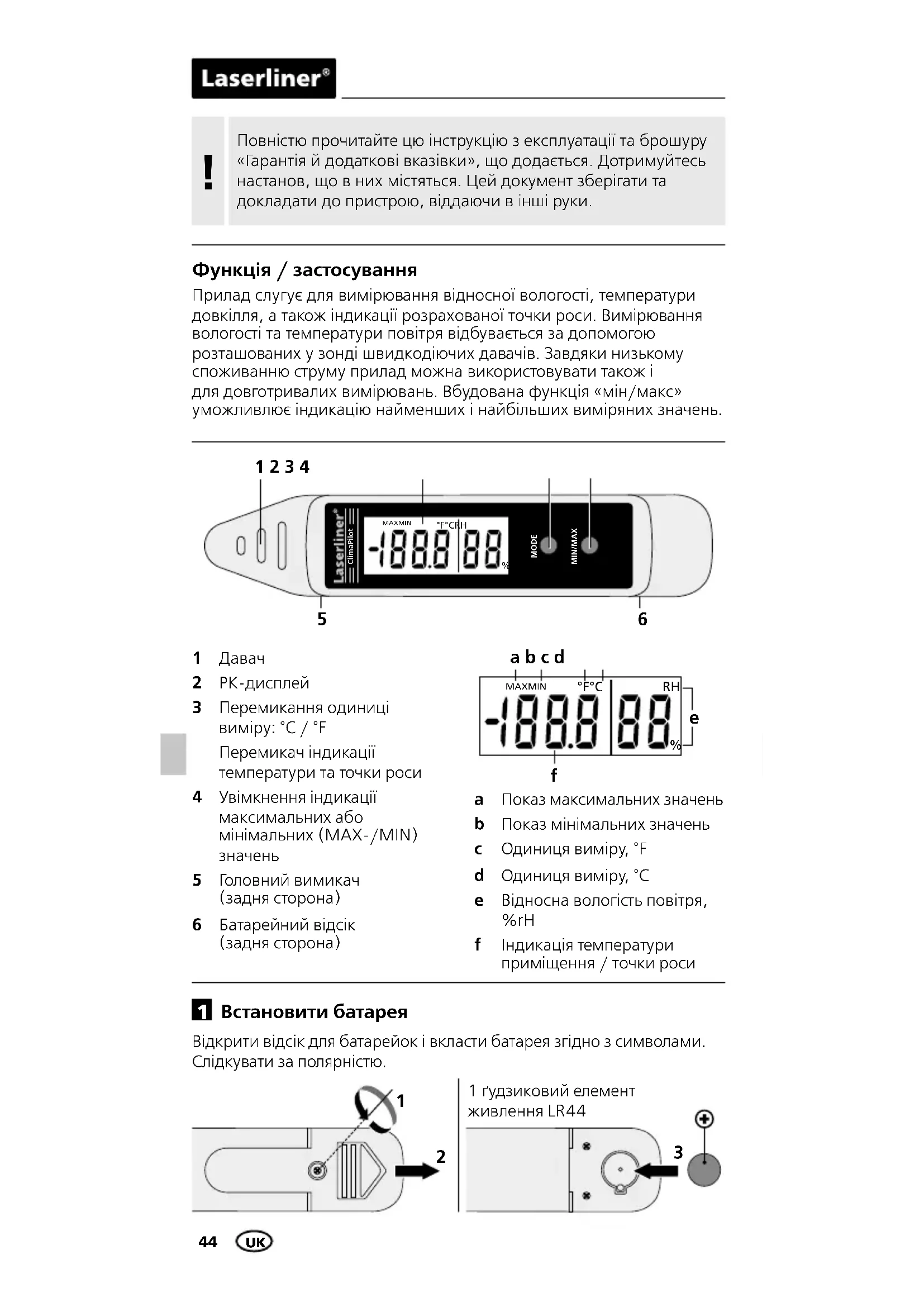 Головний вимикач (задня сторона) Батарейний відсік (задня сторона) Показ максимальних значень Показ мінімальних значень Одиниця виміру, °F Одиниця виміру, °C Відносна вологість повітря, %rH Індикація температури приміщення / точки роси