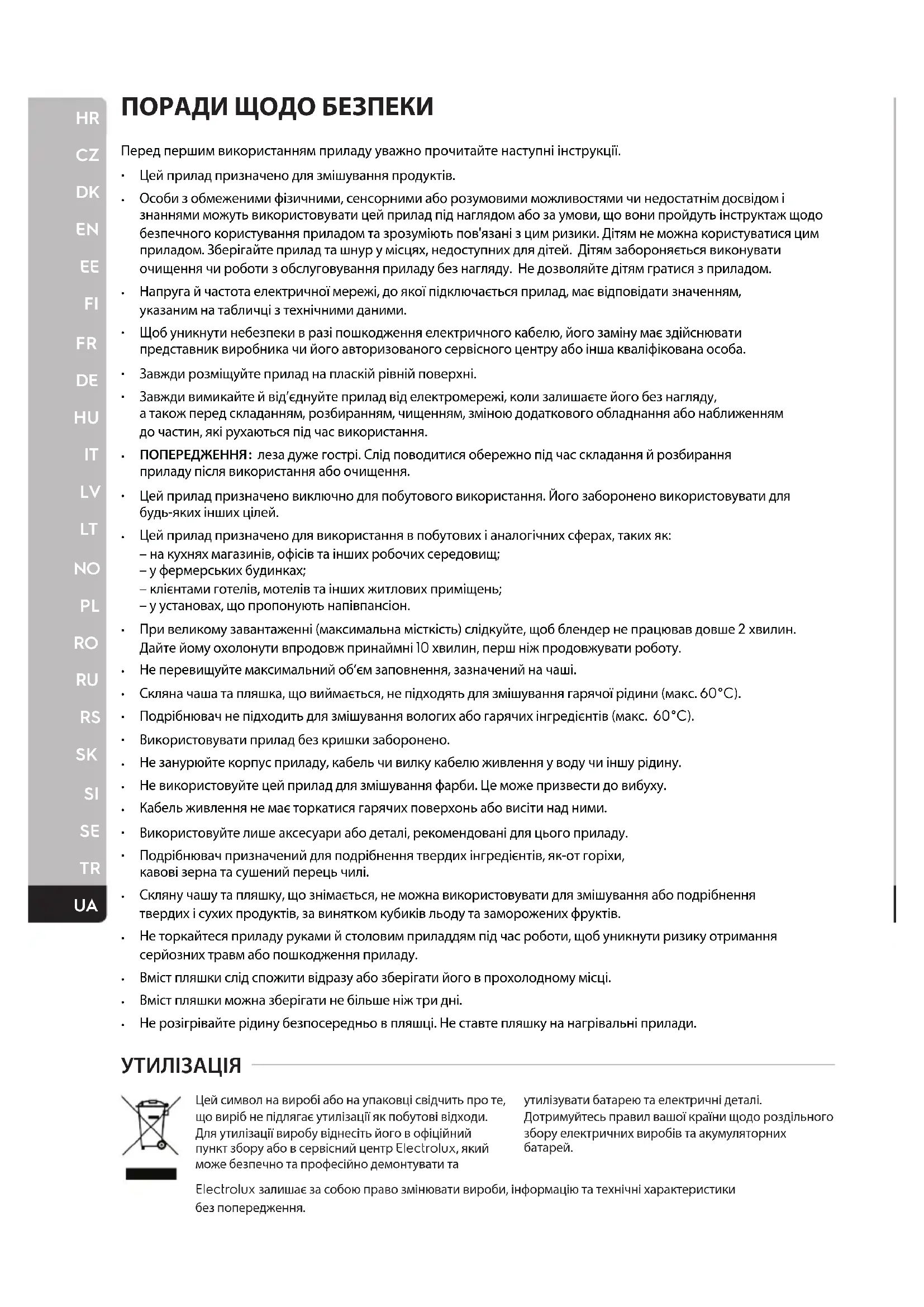 Electrolux залишає за собою право змінювати вироби, інформацію та технічні характеристики без попередження. Цей символ на виробі або на упаковці свідчить про те, що виріб не підлягає утилізації як побутові відходи. Для утилізації виробу віднесіть його в офіційний пункт збору або в сервісний центр Electrolux, який може безпечно та професійно демонтувати та утилізувати батарею та електричні деталі. Дотримуйтесь правил вашої країни щодо роздільного збору електричних виробів та акумуляторних батарей.HR