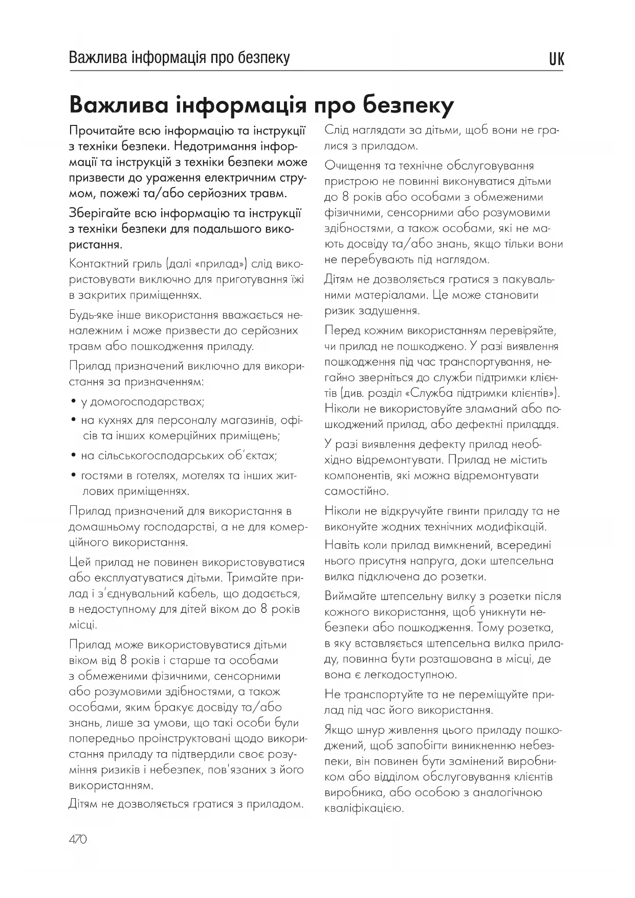 Прилад може використовуватися дітьми віком від 8років і старше та особами з обмеженими фізичними, сенсорними або розумовими здібностями, а також особами, яким бракує досвіду та/або знань, лише за умови, що такі особи були попередньо проінструктовані щодо викори- стання приладу та підтвердили своє розу- міння ризиків і небезпек, пов'язаних з його використанням. Дітям не дозволяється гратися з приладом. Важлива інформація про безпеку Слід наглядати за дітьми, щоб вони не гра- лися з приладом. Очищення та технічне обслуговування пристрою не повинні виконуватися дітьми до 8років або особами з обмеженими фізичними, сенсорними або розумовими здібностями, а також особами, які не ма- ють досвіду та/або знань, якщо тільки вони не перебувають під наглядом. Дітям не дозволяється гратися з пакуваль- ними матеріалами. Це може становити ризик задушення. Перед кожним використанням перевіряйте, чи прилад не пошкоджено. У разі виявлення пошкодження під час транспортування, не- гайно зверніться до служби підтримки клієн- тів (див. розділ «Служба підтримки клієнтів»). Ніколи не використовуйте з ламаний або по- шкоджений прилад, або дефектні приладдя. У разі виявлення дефекту прилад необ- хідно відремонтувати. Прилад не містить компонентів, які можна відремонтувати самостійно. Ніколи не відкручуйте гвинти приладу та не виконуйте жодних технічних модифікацій. Навіть коли прилад вимкнений, всередині нього присутня напруга, доки штепсельна вилка підключена до розетки. Виймайте штепсельну вилку з розетки після кожного використання, щоб уникнути не- безпеки або пошкодження. Тому розетка, в яку вставляється штепсельна вилка прила- ду, повинна бути розташована в місці, де вона є легкодоступною. Не транспортуйте та не переміщуйте при- лад під час його використання. Якщо шнур живлення цього приладу пошко- джений, щоб запобігти виникненню небез- пеки, він повинен бути замінений виробни- ком або відділом обслуговування клієнтів виробника, або особою з аналогічною кваліфікацією. UK471 Важлива інформація про безпеку