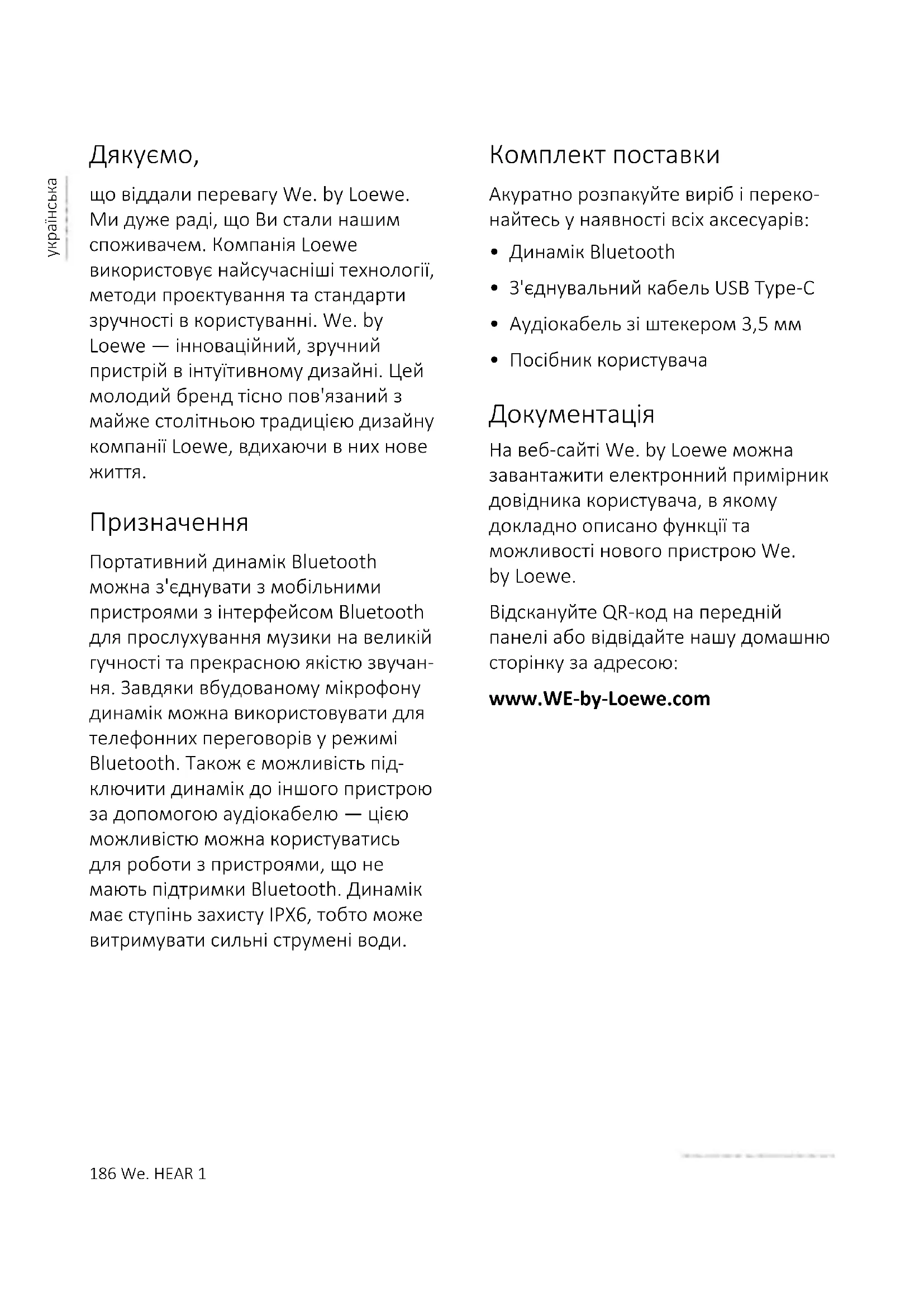 - Посібник користувача Документація На веб-сайті We. by Loewe можна завантажити електронний примірник довідника користувача, в якому докладно описано функції та можливості нового пристрою We. by Loewe. Відскануйте QR-код на передній панелі або відвідайте нашу домашню сторінку за адресою: www.WE-by-Loewe.comWe. HEAR 1 187
