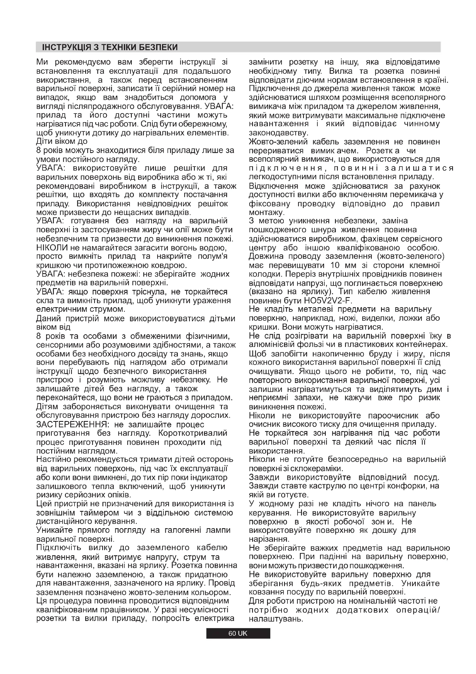 8 років та особами з обмеженими фізичними, сенсорними або розумовими здібностями, а також особами без необхідного досвіду та знань, якщо вони перебувають під наглядом або отримали інструкції щодо безпечного використання пристрою і розуміють можливу небезпеку. Не залишайте дітей без нагляду, а також переконайтеся, що вони не граються з приладом. Дітям забороняється виконувати очищення та обслуговування пристрою без нагляду дорослих. Цей пристрій не призначений для використання із зовнішнім таймером чи з віддільною системою дистанційного керування. Настійно рекомендується тримати дітей осторонь від варильних поверхонь, під час їх експлуатації або коли вони вимкнені, до тих пір поки індикатор залишкового тепла включений, щоб уникнути ризику серйозних опіків. Підключіть вилку до заземленого кабелю живлення, який витримує напругу, струм та навантаження, вказані на ярлику. Розетка повинна бути належно заземленою, а також придатною для навантаження, зазначеного на ярлику. Провід заземлення позначено жовто-зеленим кольором. Ця процедура повинна проводитися відповідним кваліфікованим працівником. У разі несумісності розетки та вилки приладу, попросіть електрика 8 років можуть знаходитися біля приладу лише за умови постійного нагляду. Ми рекомендуємо вам зберегти інструкції зі встановлення та експлуатації для подальшого використання, а також перед встановленням варильної поверхні, записати її серійний номер на випадок, якщо вам знадобиться допомога у вигляді післяпродажного обслуговування. УВАГА: прилад та його доступні частини можуть нагріватися під час роботи. Слід бути обережному, щоб уникнути дотику до нагрівальних елементів. Діти віком до УВАГА: використовуйте лише решітки для варильних поверхонь від виробника або ж ті, які рекомендовані виробником в інструкції, а також решітки, що входять до комплекту постачання приладу. Використання невідповідних решіток може призвести до нещасних випадків. УВАГА: готування без нагляду на варильній поверхні із застосуванням жиру чи олії може бути небезпечним та призвести до виникнення пожежі. НІКОЛИ не намагайтеся загасити вогонь водою, просто вимкніть прилад та накрийте полум'я кришкою чи протипожежною ковдрою. ЗАСТЕРЕЖЕННЯ: не залишайте процес приготування без нагляду. Короткотривалий процес приготування повинен проходити під постійним наглядом. Уникайте прямого погляду на галогенні лампи варильної поверхні. Щоб запобігти накопиченню бруду і жиру, після кожного використання варильної поверхні її слід очищувати. Якщо цього не робити, то, під час повторного використання варильної поверхні, усі залишки нагріватимуться та виділятимуть дим і неприємні запахи, не кажучи вже про ризик виникнення пожежі. Не використовуйте варильну поверхню для зберігання будь-яких предметів. Уникайте ковзання посуду по варильній поверхні. Не зберігайте важких предметів над варильною поверхнею. При падінні на варильну поверхню, вони можуть призвести до пошкодження. Не торкайтеся зон нагрівання під час роботи варильної поверхні та деякий час після її використання. У жодному разі не кладіть нічого на панель керування. Не використовуйте варильну поверхню в якості робочої зон и. Не використовуйте поверхню як дошку для