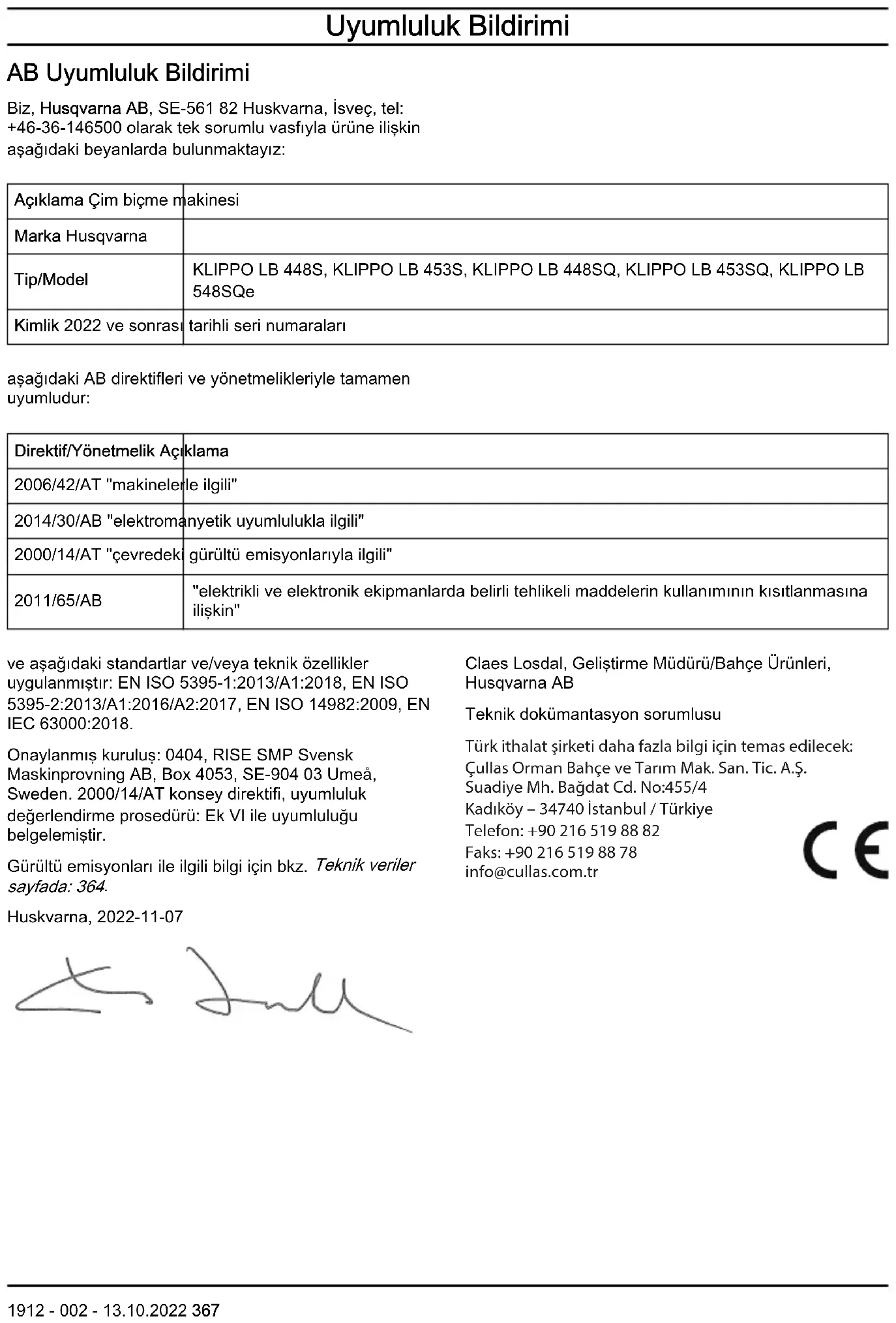 380 1912 - 002 - 13.10.2022Декларація відповідності Декларація відповідності ЄС Ми, компанія Husqvarna AB, SE-561 82 Huskvarna, Швеція, тел.: +46-36-146500, заявляємо під свою виключну відповідальність, що представлений виріб: Опис Газонокосарка Бренд Husqvarna Тип/ модель KLIPPO LB 448S, KLIPPO LB 453S, KLIPPO LB 448SQ, KLIPPO LB 453SQ, KLIPPO LB 548SQe Ідентифікація Серійні номери за 2022рік і пізніше повністю відповідає таким директивам і нормам ЄС: Директива/норма Опис 2006/42/EC «Про механічне обладнання» 2014/30/EU «Про електромагнітну сумісність» 2000/14/EC «Про виділення шуму в навколишнє середовище» 2011/65/EU «Про обмеження використання деяких небезпечних речовин в електричному й елек- тронному обладнанні» і що до нього застосовуються вказані далі узгоджені стандарти та(або) технічні специфікації: EN ISO