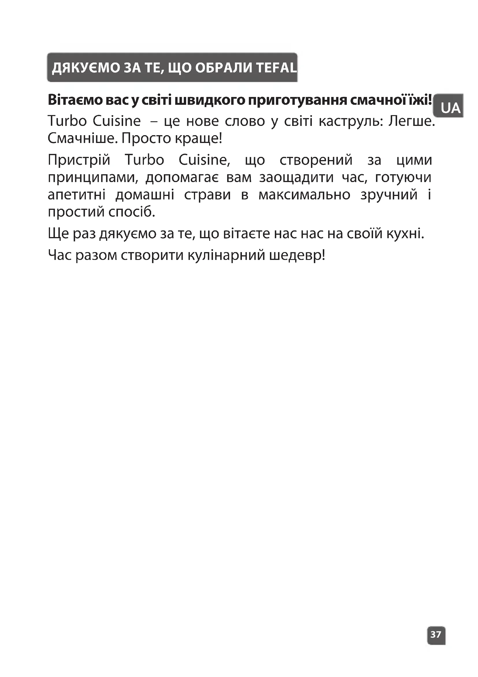 ДЯКУЄМО ЗА ТЕ, ЩО ОБРАЛИ TEFAL Вітаємо вас у світі швидкого приготування смачної їжі! Turbo Cuisine – це нове слово у світі каструль: Легше. Смачніше. Просто краще! Пристрій Turbo Cuisine, що створений за цими принципами, допомагає вам заощадити час, готуючи апетитні домашні страви в максимально зручний і простий спосіб. Ще раз дякуємо за те, що вітаєте нас нас на своїй кухні. Час разом створити кулінарний шедевр!3938