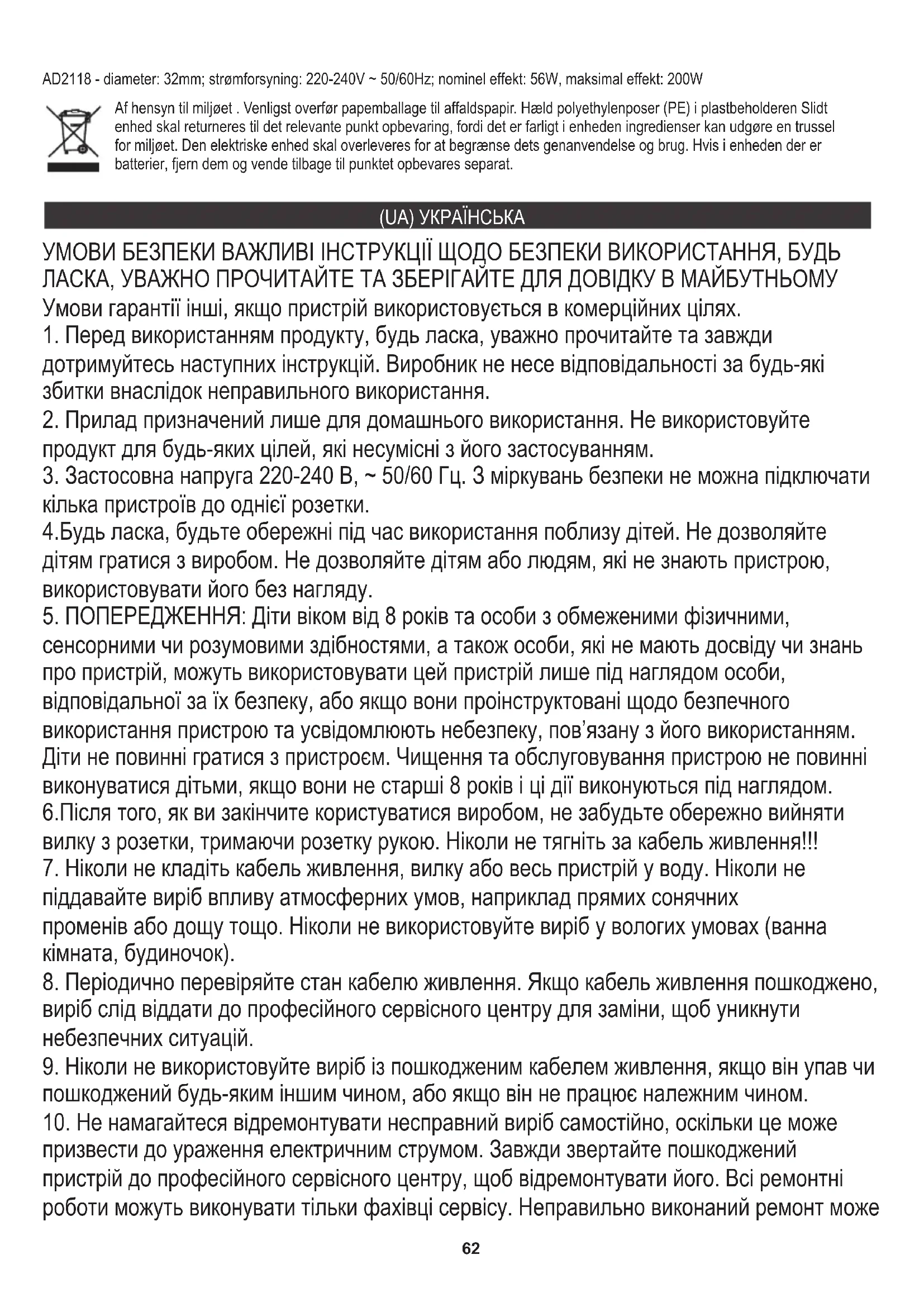 призвести до ураження електричним струмом. Завжди звертайте пошкоджений пристрій до професійного сервісного центру, щоб відремонтувати його. Всі ремонтні роботи можуть виконувати тільки фахівці сервісу. Неправильно виконаний ремонт може 6.Після того, як ви закінчите користуватися виробом, не забудьте обережно вийняти вилку з розетки, тримаючи розетку рукою. Ніколи не тягніть за кабель живлення!!! Умови гарантії інші, якщо пристрій використовується в комерційних цілях. (UA) УКРАЇНСЬКА Af hensyn til miljøet . Venligst overfør papemballage til affaldspapir. Hæld polyethylenposer (PE) i plastbeholderen Slidt enhed skal returneres til det relevante punkt opbevaring, fordi det er farligt i enheden ingredienser kan udgøre en trussel for miljøet. Den elektriske enhed skal overleveres for at begrænse dets genanvendelse og brug. Hvis i enheden der er batterier, fjern dem og vende tilbage til punktet opbevares separat. AD2118 - diameter: 32mm; strømforsyning: 220-240V ~ 50/60Hz; nominel effekt: 56W, maksimal effekt: 200W63