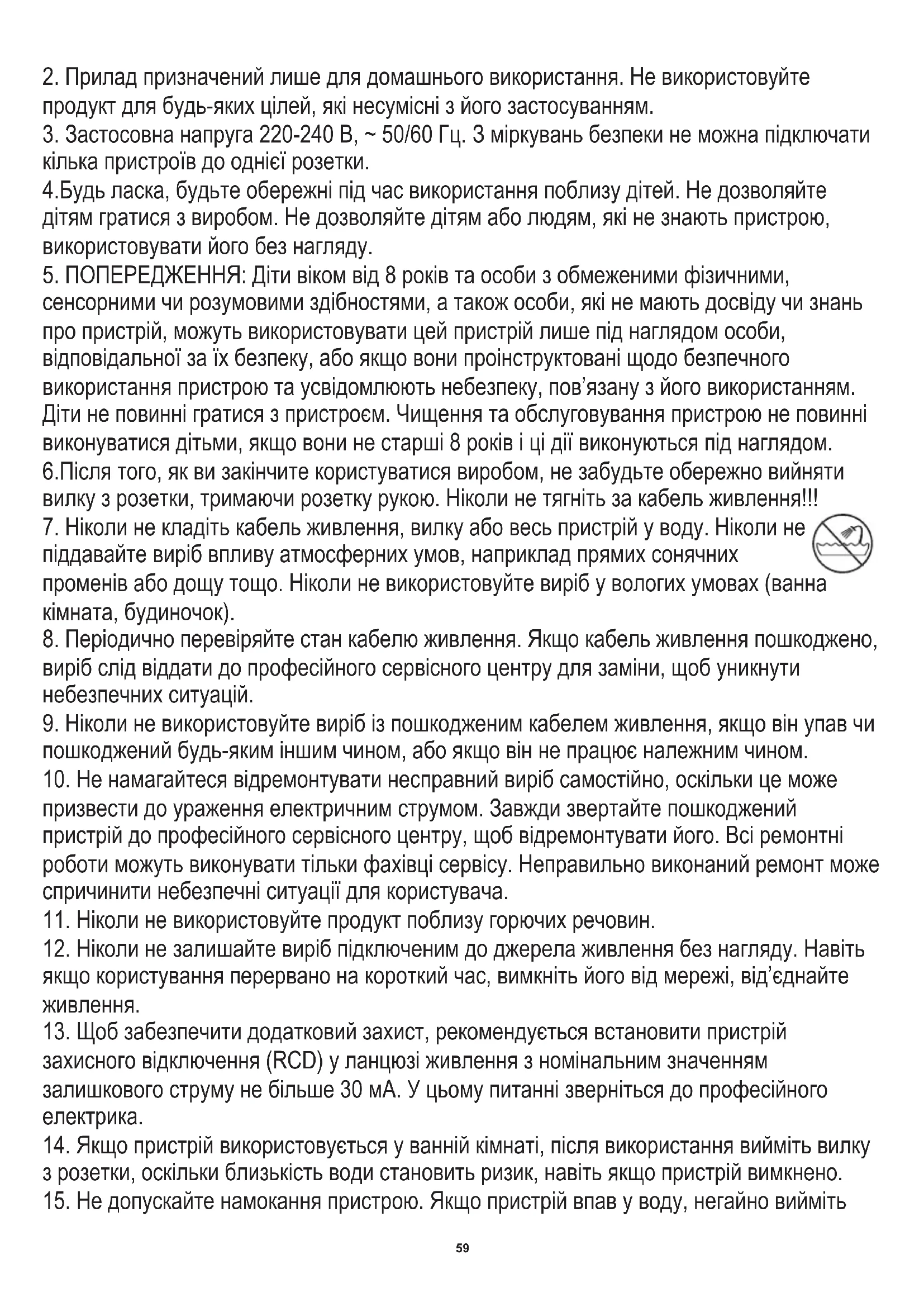сенсорними чи розумовими здібностями, а також особи, які не мають досвіду чи знань про пристрій, можуть використовувати цей пристрій лише під наглядом особи, відповідальної за їх безпеку, або якщо вони проінструктовані щодо безпечного використання пристрою та усвідомлюють небезпеку, пов’язану з його використанням. Діти не повинні гратися з пристроєм. Чищення та обслуговування пристрою не повинні виконуватися дітьми, якщо вони не старші 8 років і ці дії виконуються під наглядом.60