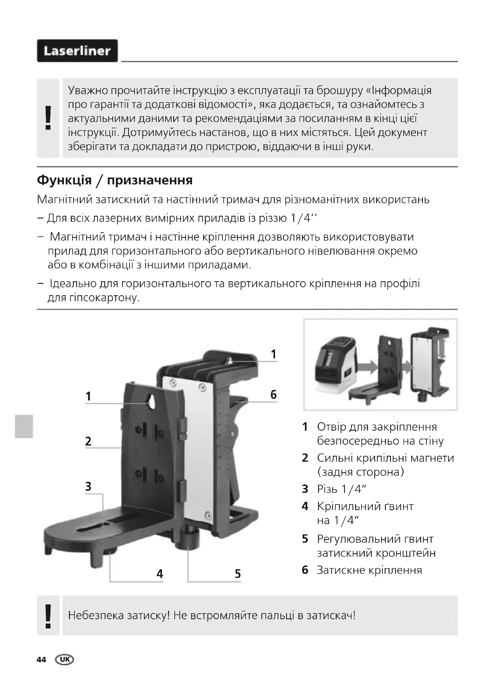 Функція / призначення Магнітний затискний та настінний тримач для різноманітних використань – Для всіх лазерних вимірних приладів із різзю 1/4‘‘ – Магнітний тримач і настінне кріплення дозволяють використовувати прилад для горизонтального або вертикального нівелювання окремо або в комбінації з іншими приладами. – Ідеально для горизонтального та вертикального кріплення на профілі для гіпсокартону. Уважно прочитайте інструкцію з експлуатації та брошуру «Інформація про гарантії та додаткові відомості», яка додається, та ознайомтесь з актуальними даними та рекомендаціями за посиланням в кінці цієї інструкції. Дотримуйтесь настанов, що в них містяться. Цей документ зберігати та докладати до пристрою, віддаючи в інші руки.