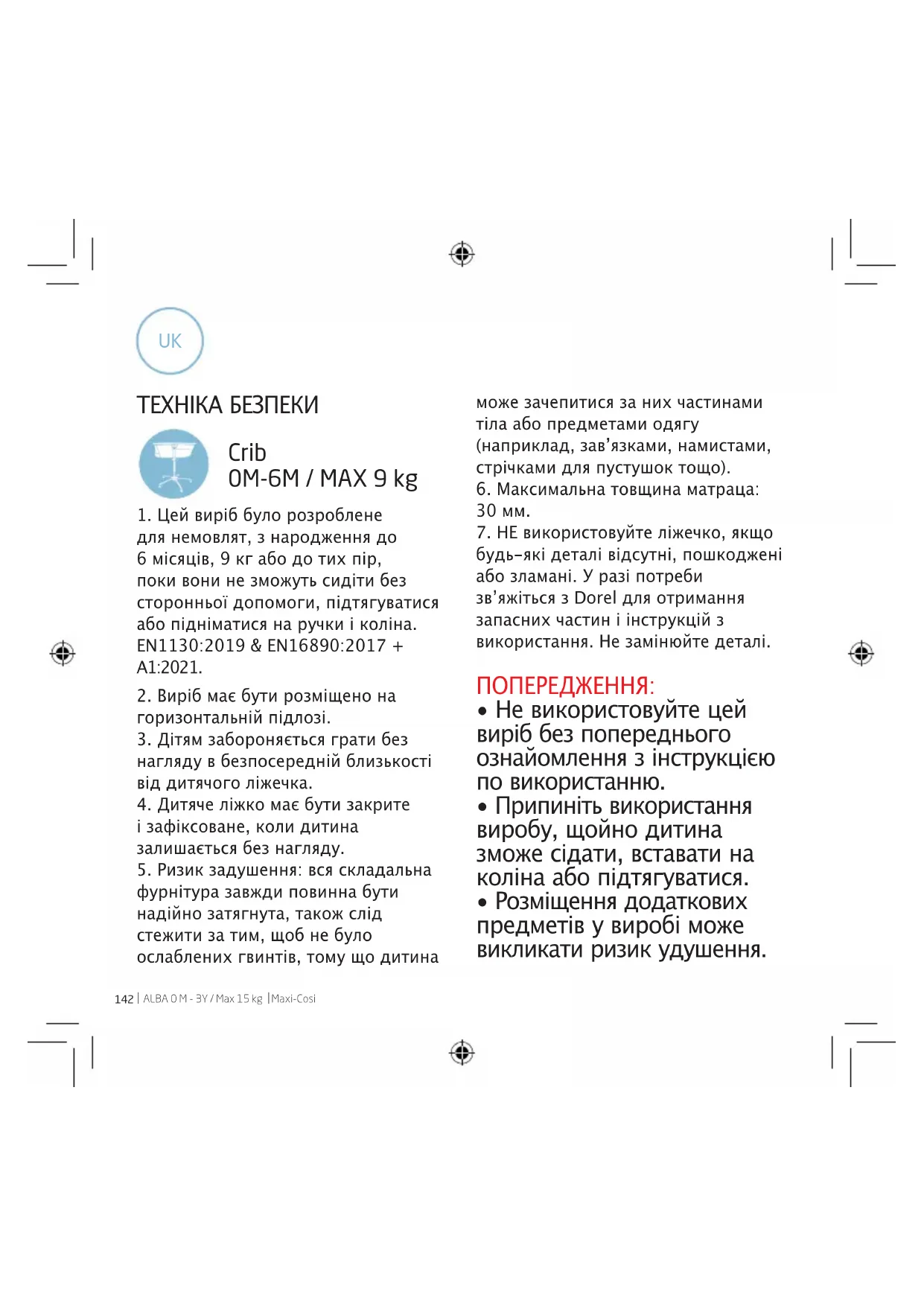 для немовлят, з народження до 6 місяців, 9 кг або до тих пір, поки вони не зможуть сидіти без сторонньої допомоги, підтягуватися або підніматися на ручки і коліна. EN1130:2019 & EN16890:2017 + A1:2021.