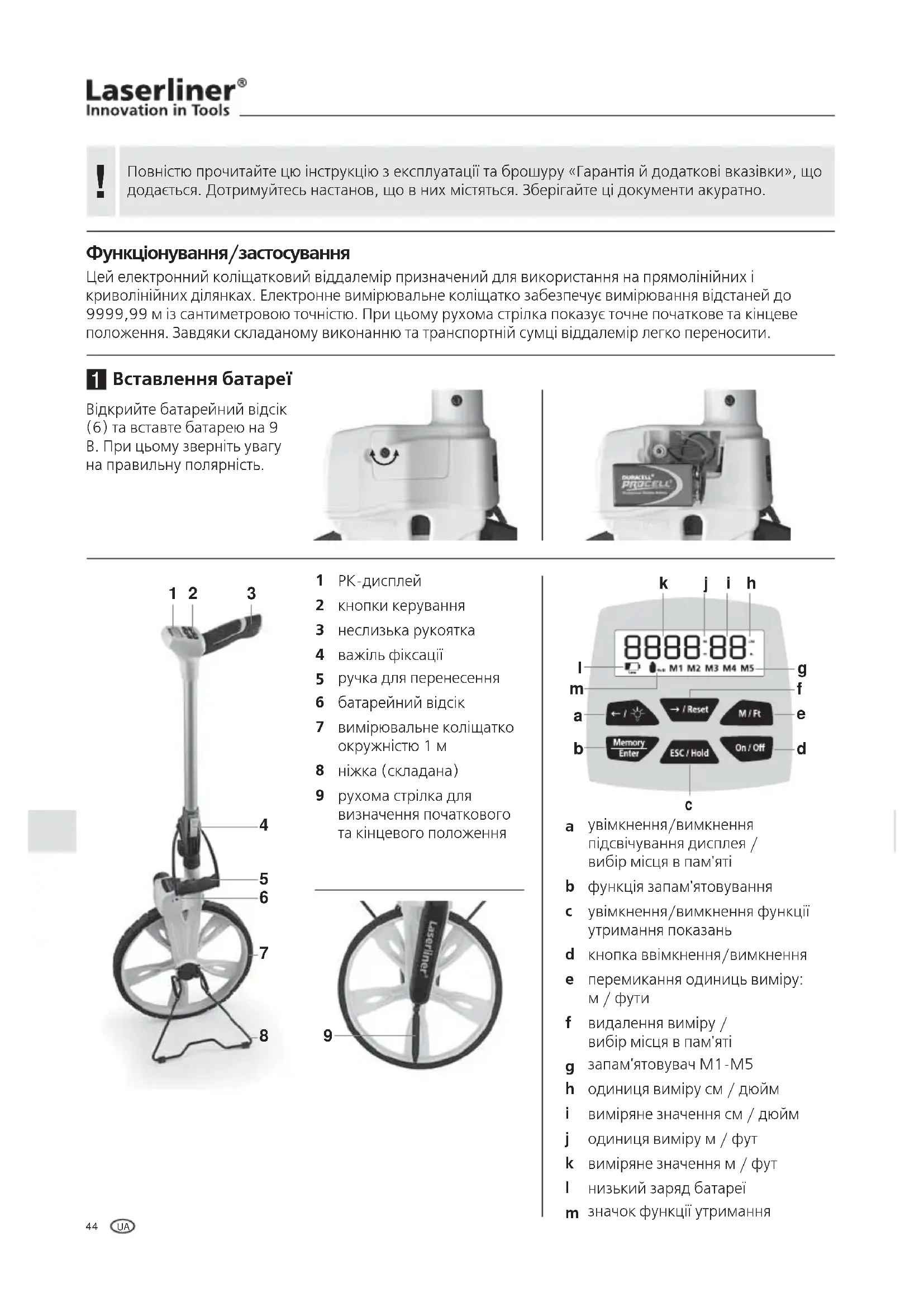 кнопки керування неслизька рукоятка важіль фіксації ручка для перенесення батарейний відсік вимірювальне коліщатко окружністю 1 м ніжка (складана) рухома стрілка для визначення початкового та кінцевого положення