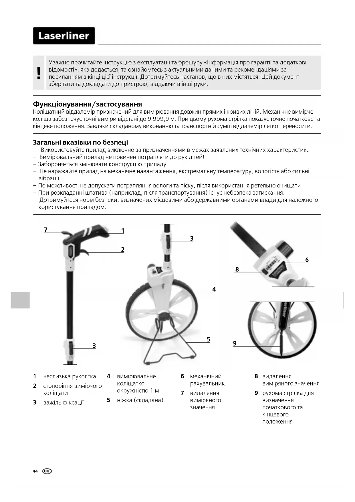 Функціонування/застосування Коліщатний віддалемір призначений для вимірювання довжин прямих і кривих ліній. Механічне вимірче коліща забезпечує точні виміри відстані до 9.999,9 м. При цьому рухома стрілка показує точне початкове та кінцеве положення. Завдяки складаному виконанню та транспортній сумці віддалемір легко переносити. Загальні вказівки по безпеці – Використовуйте прилад виключно за призначеннями в межах заявлених технічних характеристик. – Вимірювальний прилад не повинен потрапляти до рук дітей! – Забороняється змінювати конструкцію приладу. – Не наражайте прилад на механічне навантаження, екстремальну температуру, вологість або сильні