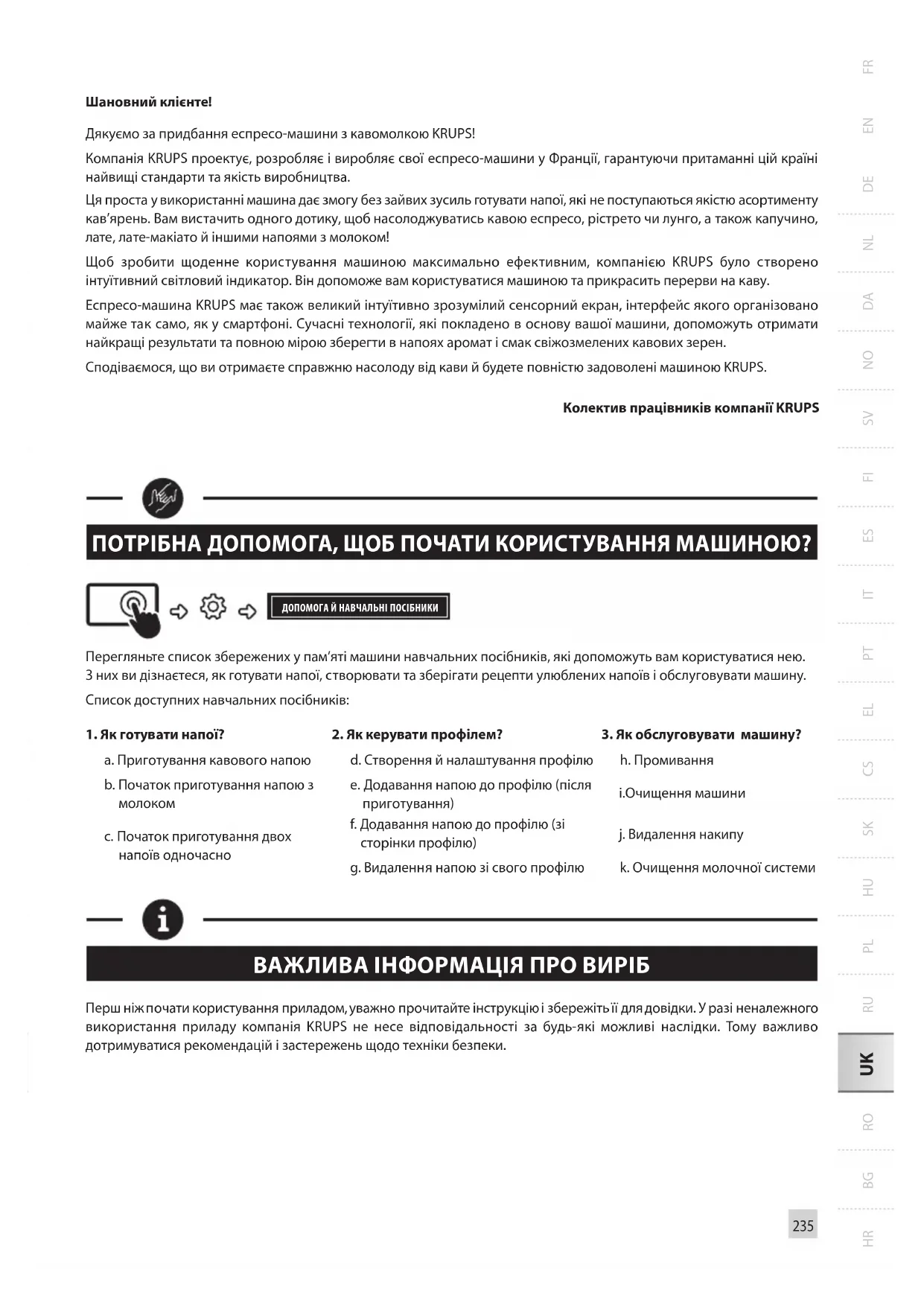 Шановний клієнте! Дякуємо за придбання еспресо-машини з кавомолкою KRUPS! Компанія KRUPS проектує, розробляє і виробляє свої еспресо-машини у Франції, гарантуючи притаманні цій країні найвищі стандарти та якість виробництва. Ця проста у використанні машина дає змогу без зайвих зусиль готувати напої, які не поступаються якістю асортименту кав’ярень. Вам вистачить одного дотику, щоб насолоджуватись кавою еспресо, рістрето чи лунго, а також капучино, лате, лате-макіато й іншими напоями з молоком! Щоб зробити щоденне користування машиною максимально ефективним, компанією KRUPS було створено інтуїтивний світловий індикатор. Він допоможе вам користуватися машиною та прикрасить перерви на каву. Еспресо-машина KRUPS має також великий інтуїтивно зрозумілий сенсорний екран, інтерфейс якого організовано майже так само, як у смартфоні. Сучасні технології, які покладено в основу вашої машини, допоможуть отримати найкращі результати та повною мірою зберегти в напоях аромат і смак свіжозмелених кавових зерен. Сподіваємося, що ви отримаєте справжню насолоду від кави й будете повністю задоволені машиною KRUPS. Колектив працівників компанії KRUPS ПОТРІБНА ДОПОМОГА, ЩОБ ПОЧАТИ КОРИСТУВАННЯ МАШИНОЮ? ДОПОМОГА Й НАВЧАЛЬНІ ПОСІБНИКИ Перегляньте список збережених у пам’яті машини навчальних посібників, які допоможуть вам користуватися нею. З них ви дізнаєтеся, як готувати напої, створювати та зберігати рецепти улюблених напоїв і обслуговувати машину. Список доступних навчальних посібників: