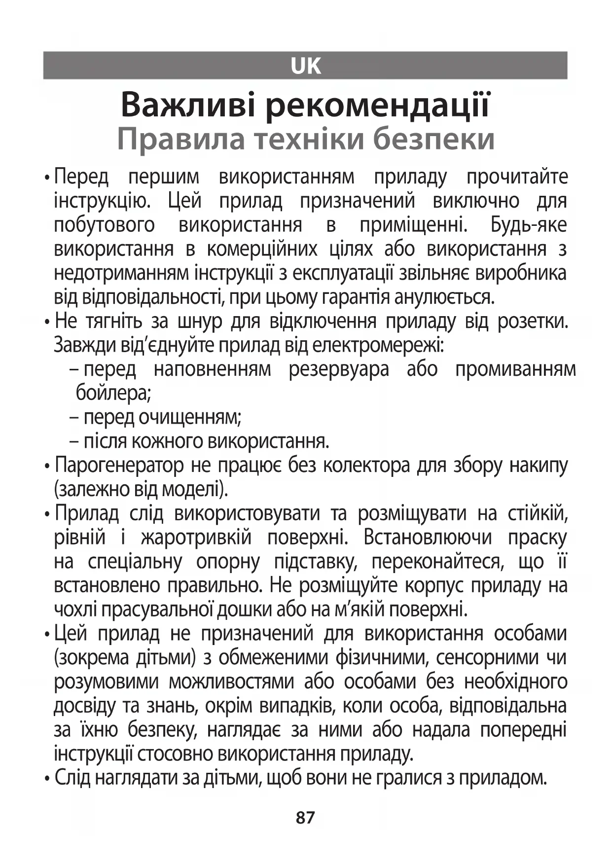 - Цей прилад не призначений для використання особами (зокрема дітьми) з обмеженими фізичними, сенсорними чи розумовими можливостями або особами без необхідного досвіду та знань, окрім випадків, коли особа, відповідальна за їхню безпеку, наглядає за ними або надала попередні інструкції стосовно використання приладу.