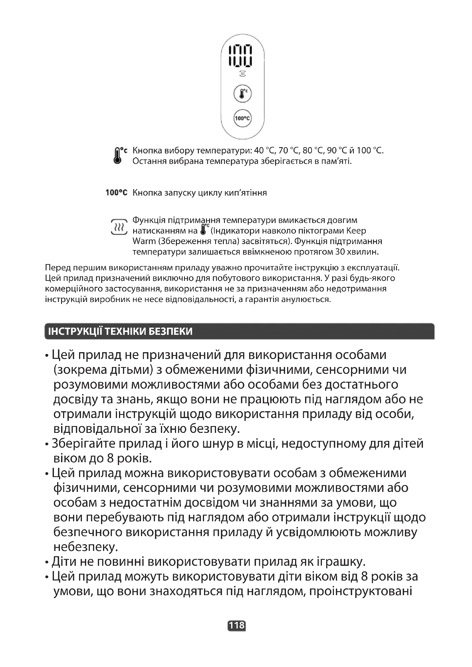 - Цей прилад можуть використовувати діти віком від 8 років за умови, що вони знаходяться під наглядом, проінструктовані ІНСТРУКЦІЇ ТЕХНІКИ БЕЗПЕКИ Кнопка вибору температури: 40°C, 70°C, 80°C, 90°C й 100°C. Остання вибрана температура зберігається в пам’яті. Кнопка запуску циклу кип’ятіння Функція підтримання температури вмикається довгим натисканням на (Індикатори навколо піктограми Keep Warm (Збереження тепла) засвітяться). Функція підтримання температури залишається ввімкненою протягом 30хвилин. Перед першим використанням приладу уважно прочитайте інструкцію з експлуатації. Цей прилад призначений виключно для побутового використання. У разі будь-якого комерційного застосування, використання не за призначенням або недотримання інструкцій виробник не несе відповідальності, а гарантія анулюється.119 стосовно безпечного використання приладу й повністю усвідомлюють пов’язану з цим небезпеку. Очищення і обслуговування приладу можуть виконувати діти, яким виповнилося 8 років, за умови, що вони перебувають під наглядом дорослої особи.