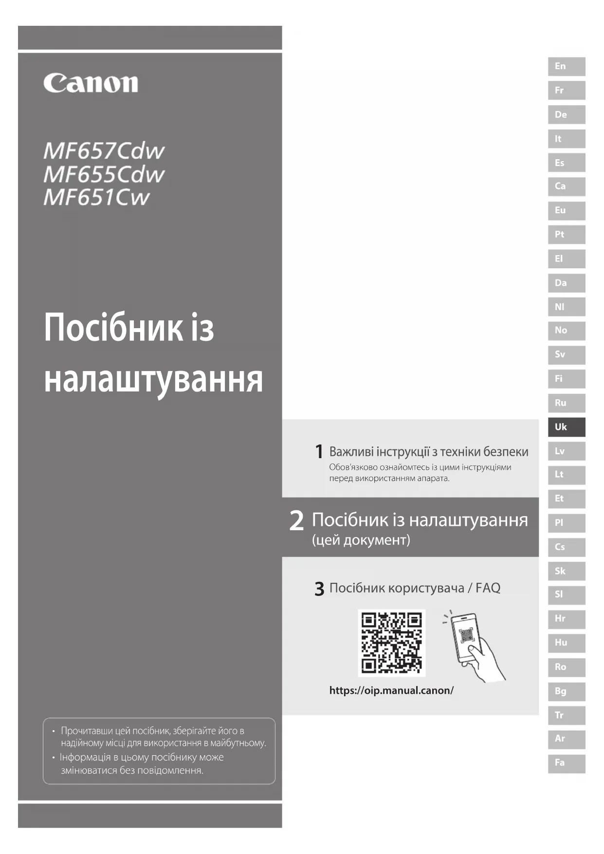 Прочитавши цей посібник, зберігайте його в надійному місці для використання в майбутньому.• Інформація в цьому посібнику може змінюватися без повідомлення.https://oip.manual.canon/ Важливі інструкції з техніки безпекиОбов’язково ознайомтесь із цими інструкціями перед використанням апарата. Посібник користувача / FAQ