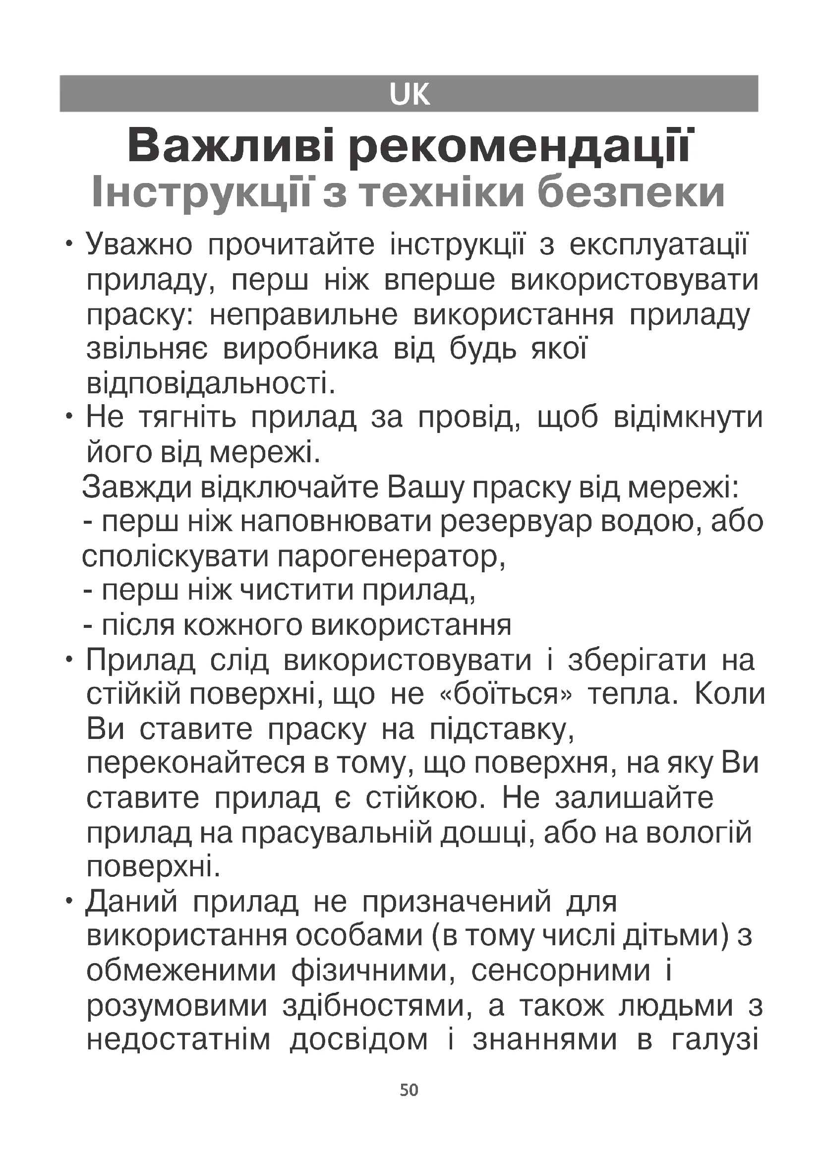 - Уважно прочитайте інструкції з експлуатації приладу, перш ніж вперше використовувати праску: неправильне використання приладу звільняє виробника від будь якої відповідальності.