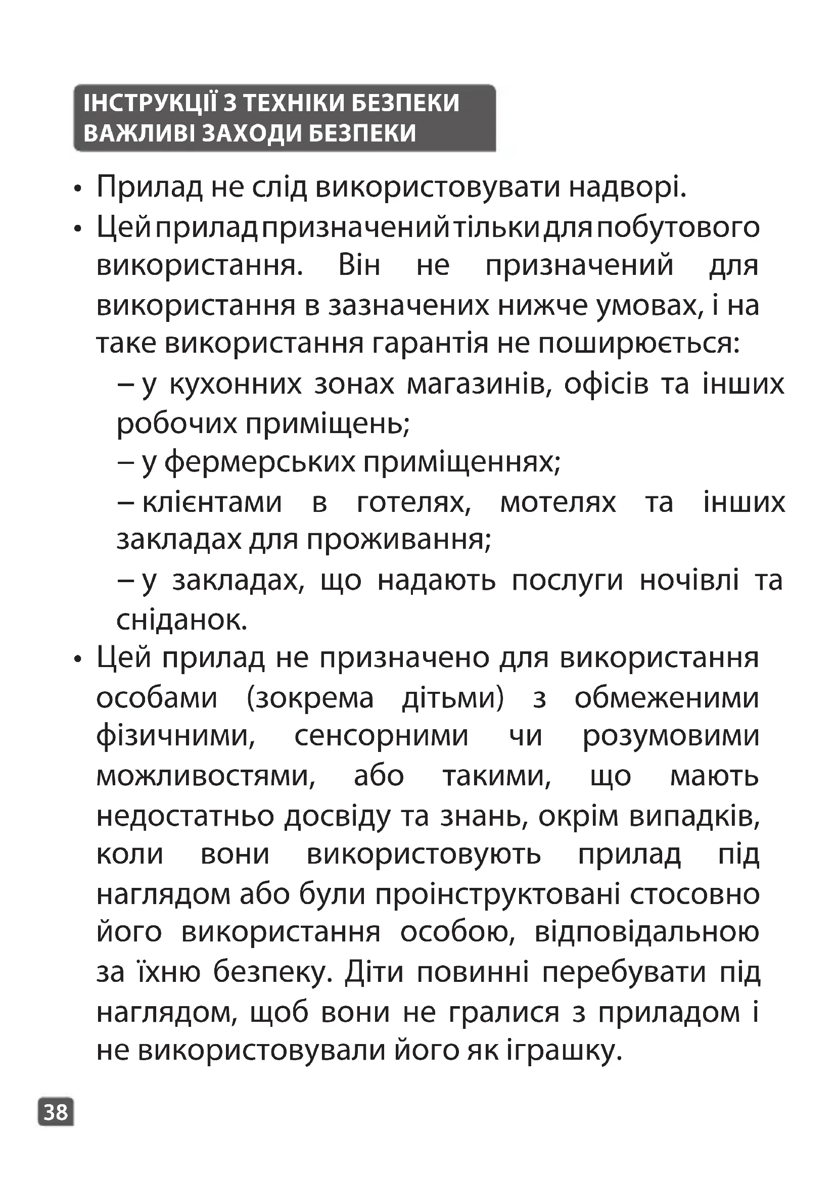 - Цей прилад не призначено для використання особами (зокрема дітьми) з обмеженими фізичними, сенсорними чи розумовими можливостями, або такими, що мають недостатньо досвіду та знань, окрім випадків, коли вони використовують прилад під наглядом або були проінструктовані стосовно його використання особою, відповідальною за їхню безпеку. Діти повинні перебувати під наглядом, щоб вони не гралися з приладом і не використовували його як іграшку.39
