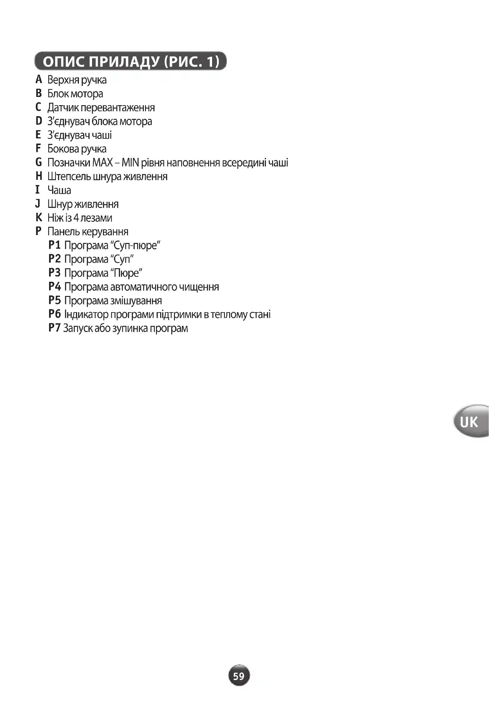 - Не занурюйте прилад у воду. Не підставляйте блок мотора (B) і чашу (I) під струмінь