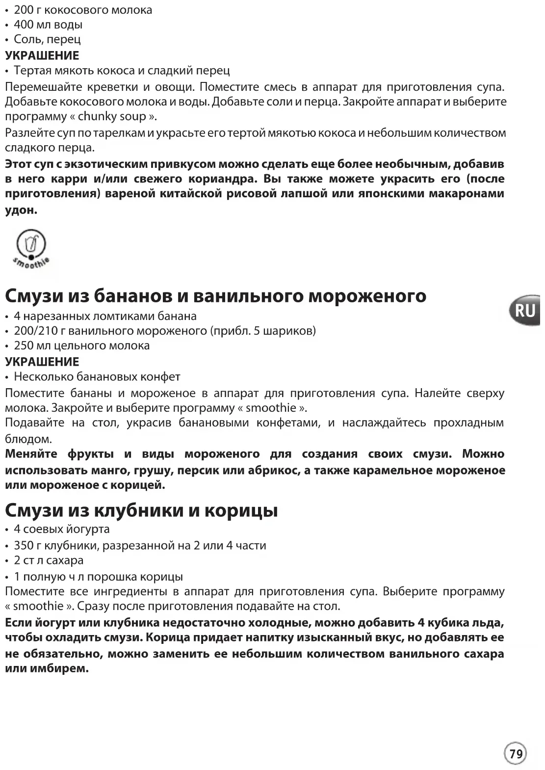 - Бананові цукерки Покладіть банани до суповарки. Залийте зверху молоком. Закрийте суповарку та оберіть режим « Smoothie » (смузі). Подавайте до столу з банановими цукерками та куштуйте одразу. Змінюйте фрукти й морозиво, щоб створити свої власні смузі. Манго, груша, персик, абрикос – усе підійде для приготування смузі, так само, як і морозиво з карамеллю або ваніллю. Полуничний смузі з корицею