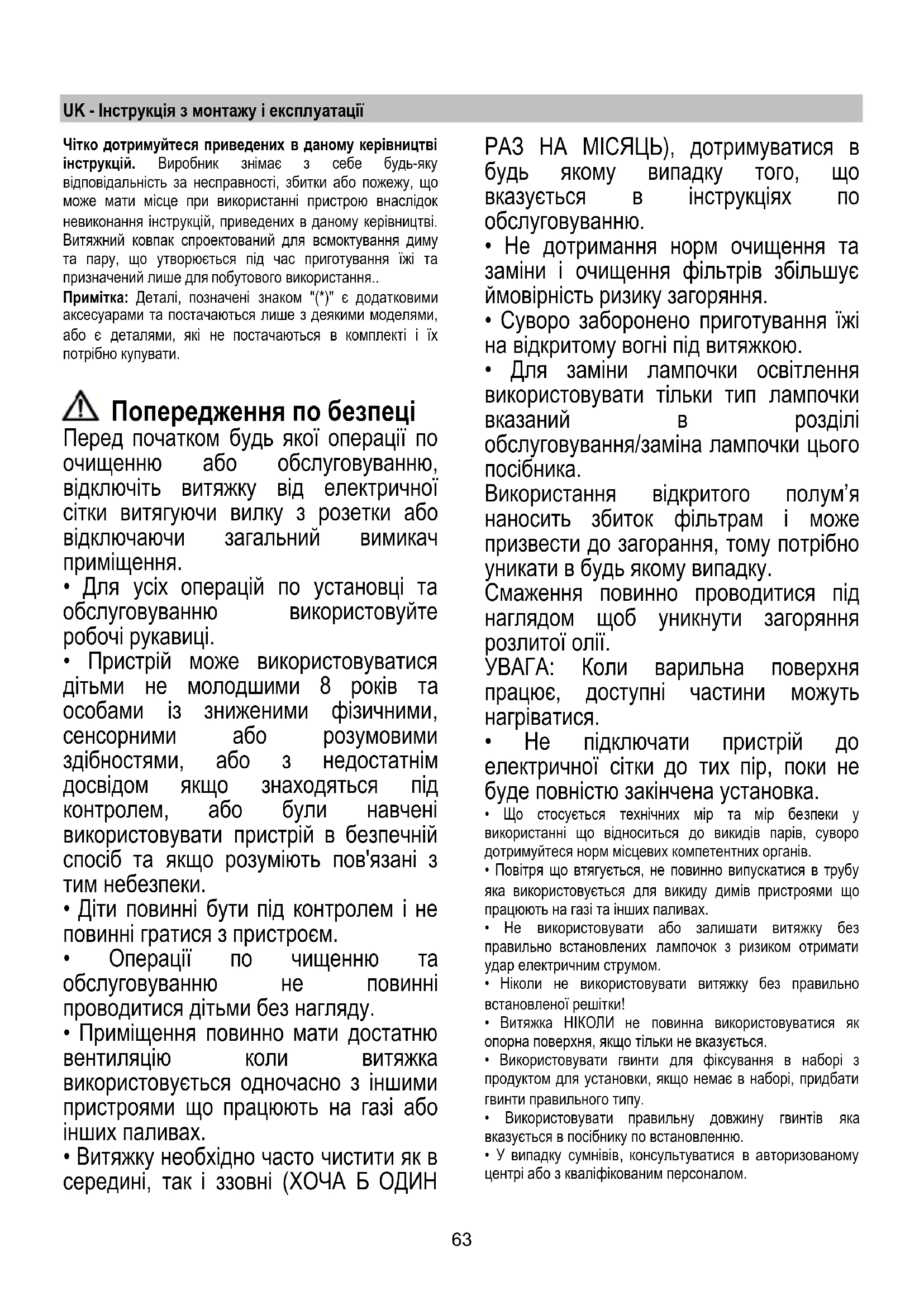 - Витяжка НІКОЛИ не повинна використовуватися як опорна поверхня, якщо тільки не вказується.