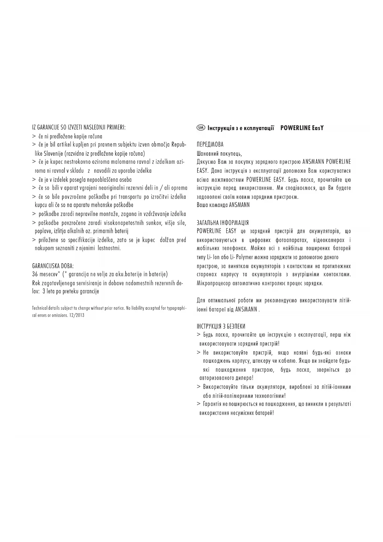 Ми пропонуємо 3-річну гарантію на цей зарядний пристрій, яка не поширюється на пошкодження, викликані: низькою якістю батарей, недотримання інструкції з експлуатації або фізичного пошкодження через неналежне використання. Технічні дані можуть бути змінені без попереднього повідомлення. Ніяка відповідальність за друкарські помилки або упущення не приймається. 12 /2013Notizen / NotesANSMANN AG . Industriestraße 10 . D-97959 Assamstadt . Germany Hotline: + 49 (0) 6294/4204 3400 . E-Mail: hotline@ansmann.de . www.ansmann.de