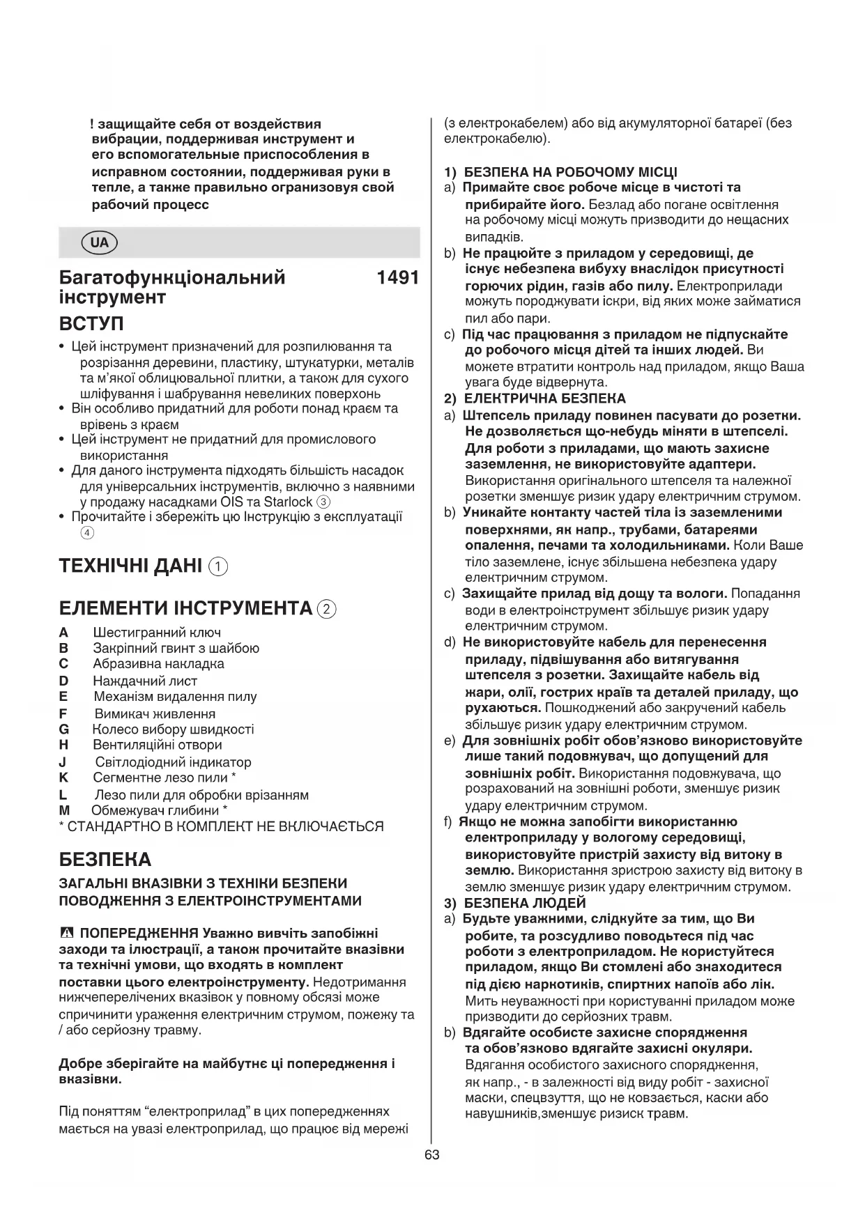 a) Віддавайте свій прилад на ремонт лише кваліфікованим фахівцям та лише з використанням оригінальних запчастин. Це забезпечить безпечність приладу на довгий час. ПРАВИЛА ТЕХНІКИ БЕЗПЕКИ ДЛЯ БАГАТОФУНКЦІОНАЛЬНИХ ІНСТРУМЕНТІВ