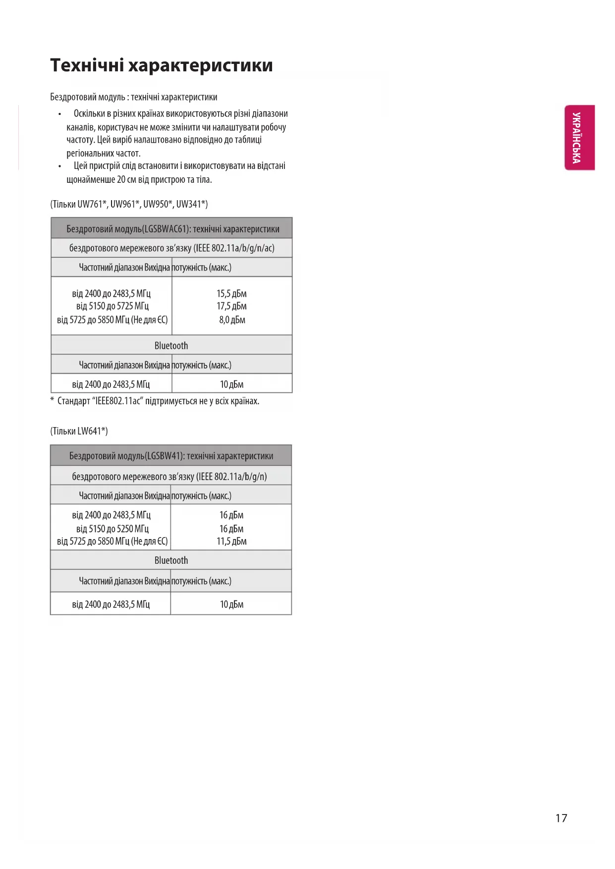 - Стандарт “IEEE802.11ac” підтримується не у всіх країнах. (Тільки LW641*) Бездротовий модуль(LGSBW41): технічні характеристики бездротового мережевого зв’язку (IEEE 802.11a/b/g/n) Частотний діапазон Вихідна потужність (макс.) від 2400 до 2483,5 МГц від 5150 до 5250 МГц від 5725 до 5850 МГц (Не для ЄС) 16 дБм 16 дБм 11,5 дБм Bluetooth Частотний діапазон Вихідна потужність (макс.) від 2400 до 2483,5 МГц 10 дБм УКРАЇНСЬКА18 Модуль CI (Ш x В x Г) 100,0 мм x 55,0 мм x 5,0 мм Умови зовнішнього