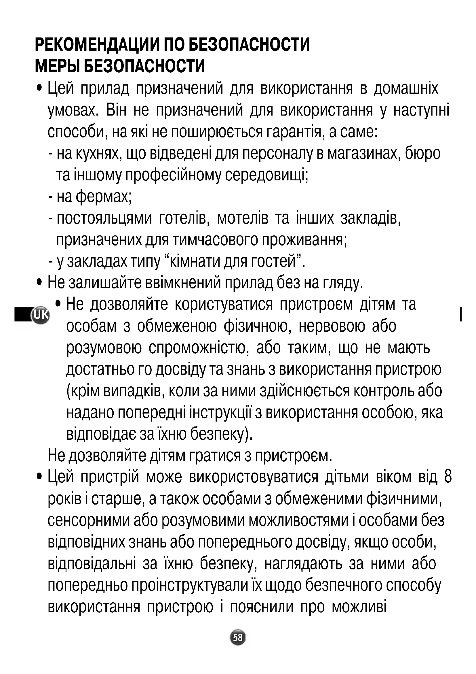 CROCTIME-NC00118045 18/02/13 09:20 Page58небезпеки, пов’язані з використанням пристрою. Не допускайте, щоб діти гралися з пристроєм. Не допускайте, щоб діти виконували чищення і обслуговування пристрою, крім випадків, коли вони старше 8 років і за ними наглядають відповідальні особи.