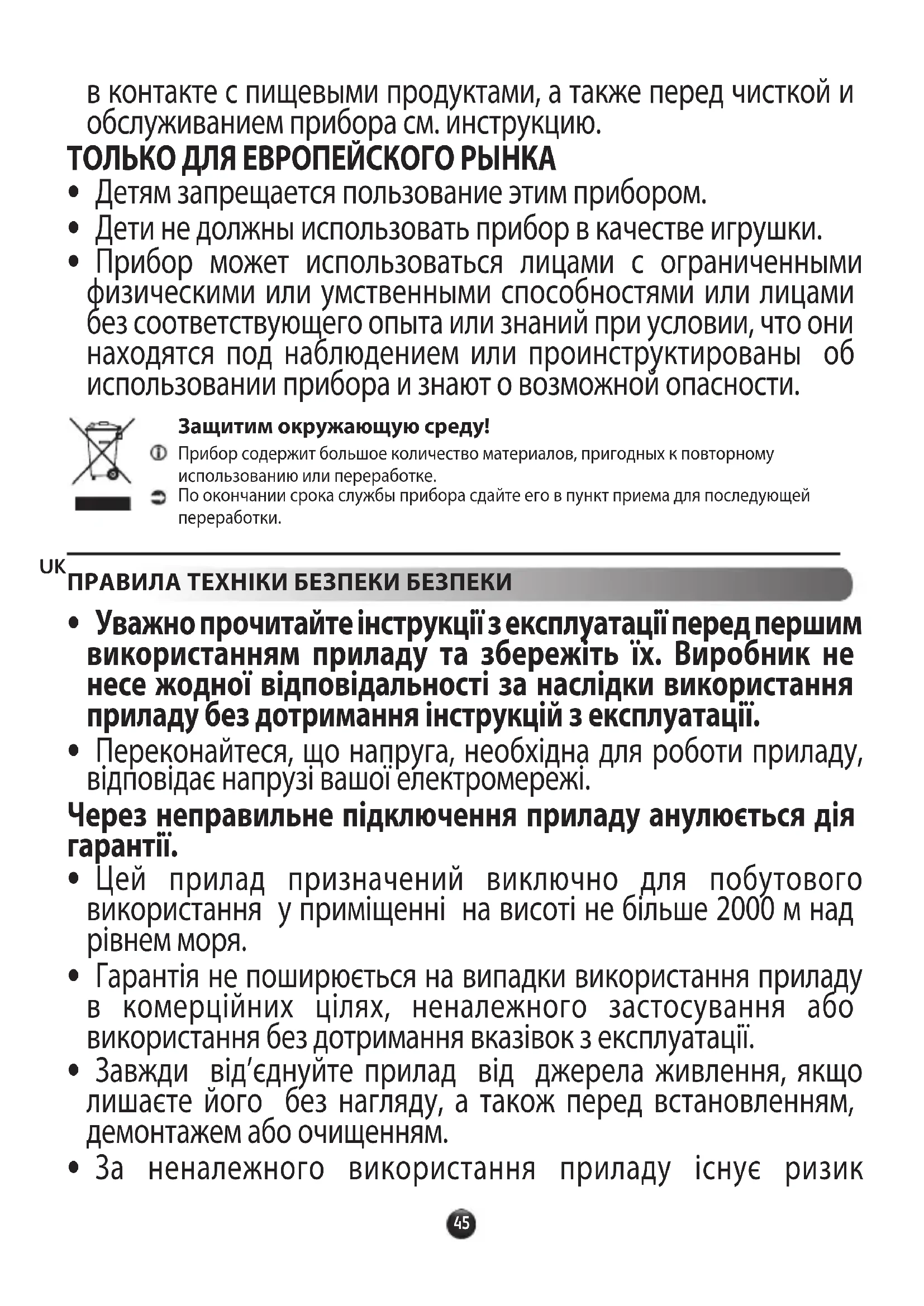 - Бережіть прилад, шнур живлення та штепсель від потрапляння води та будь-якої іншої рідини.47