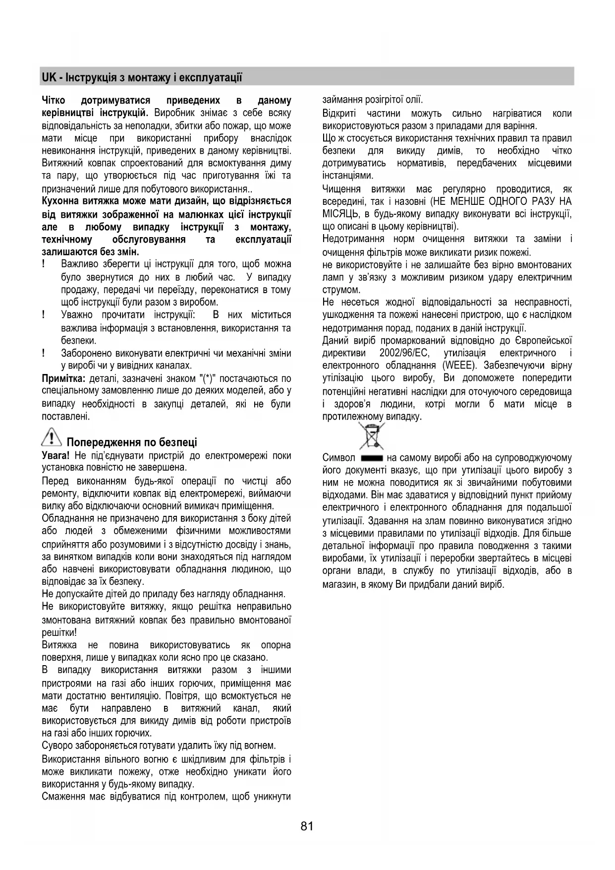 лише у випадках коли ясно про це сказано. В випадку використання витяжки разом з іншими пристроями на газі або інших горючих, приміщення має мати достатню вентиляцію. Повітря, що всмоктується не має бути направлено в витяжний канал, який використовується для викиду димів від роботи пристроїв на газі або інших горючих. Суворо забороняється готувати удалить їжу під вогнем. Використання вільного вогню є шкідливим для фільтрів і може викликати пожежу, отже необхідно уникати його використання у будь-якому випадку. Смаження має відбуватися під контролем, щоб уникнути займання розігрітої олії. Відкриті частини можуть сильно нагріватися коли використовуються разом з приладами для варіння. Що ж стосується використання технічних правил та правил безпеки для викиду димів, то необхідно чітко дотримуватись нормативів, передбачених місцевими інстанціями. Чищення витяжки має регулярно проводитися, як всередині, так і назовні (НЕ МЕНШЕ ОДНОГО РАЗУ НА МІСЯЦЬ, в будь-якому випадку виконувати всі інструкції, що описані в цьому керівництві). Недотримання норм очищення витяжки та заміни