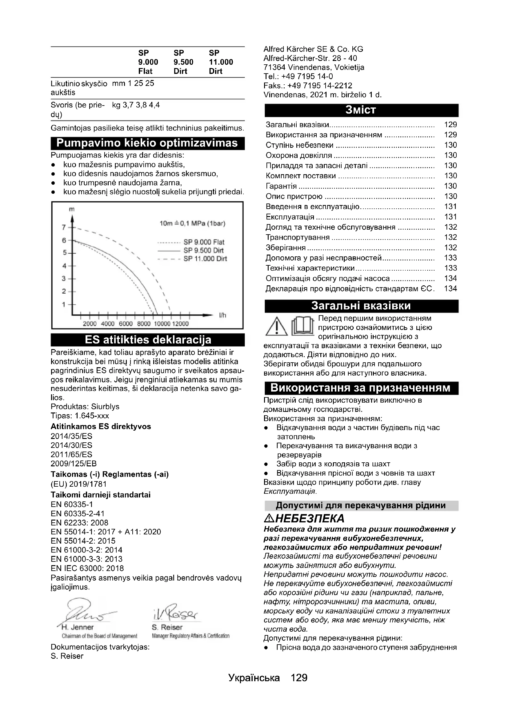 Dirt134 日本語 Зберігається право на внесення технічних змін. Оптимізація обсягу подачі насоса Обсяг подачі тим більший: ●чим менша висота подачі. ●чим більший діаметр використовуваного шланга. ●чим коротше використовуваний шланг. ●чим менше падіння тиску, обумовлене приєднанням додаткового обладнання. Декларація про відповідність стандартам ЄС Цим ми повідомляємо, що нижче зазначена машина на основі своєї конструкції та конструктивного виконання, а також у випущеної у продаж моделі, відповідає спеціальним основним вимогам щодо безпеки та захисту здоров'я представлених нижче директив ЄС. У разі внесення неузгоджених із нами змін до машини ця заява втрачає свою чинність. Виріб: НасосТип: 1.645-xxx Відповідні директиви ЄС 2014/35/ЄС2014/30/ЄС2011/65/ЄС2009/125/ЄС Застосований(-і) регламент(-и) (ЄС) 2019/1781 Застосовувані гармонізовані стандарти EN 60335-1EN 60335-2-41EN 62233: 2008EN 55014-1: 2017 + A11: 2020EN 55014-2: 2015EN 61000-3-2: 2014EN 61000-3-3: 2013EN IEC 63000: 2018 Особи, що нижче підписалися, діють від імені та за довіреністю керівництва. Особа, відповідальна за ведення документації: Ш. Райзер (S. Reiser)Alfred Kärcher SE & Co. KGAlfred-Kärcher-Str. 28 - 4071364 Winnenden (Germany)Тел.: +49 7195 14-0Факс: +49 7195 14-2212м. Вінненден, 01.06.2021