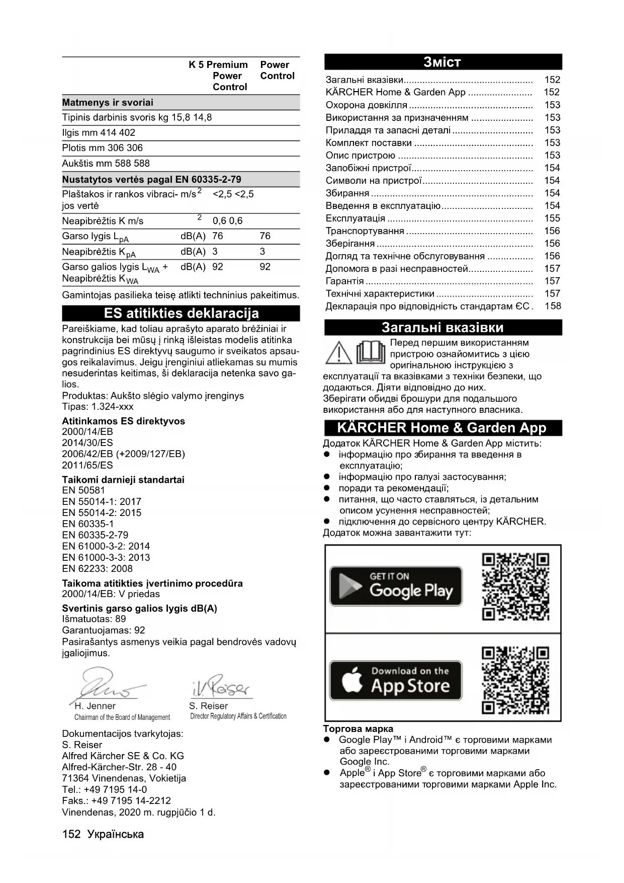 m0,5 0,5 Робочі характеристики пристрою Робочий тиск MPa 12,5 12,5 Макс. допустимий тиск MPa 14,5 14,5158 Қазақша Зберігається право на внесення технічних змін. Декларація про відповідність стандартам ЄС Цим ми повідомляємо, що нижче зазначена машина на основі своєї конструкції та конструктивного виконання, а також у випущеної у продаж моделі, відповідає спеціальним основним вимогам щодо безпеки та захисту здоров'я представлених нижче директив ЄС. У разі внесення неузгоджених із нами змін до машини ця заява втрачає свою чинність. Виріб: Миючий ап арат високого тиску Тип: 1.324-xxx Відповідні директиви ЄС 2000/14/ЄС 2014/30/ЄС 2006/42/EG (+2009/127/EG) 2011/65/ЄС Застосовувані гармонізовані стандарти EN 50581 EN 55014-1: 2017 EN 55014-2: 2015 EN 60335-1 EN 60335-2-79 EN 61000-3-2: 2014 EN 61000-3-3: 2013 EN 62233: 2008 Застосовуваний метод оцінки відповідності 2000/14/ЄС: Додаток V Рівень звукової потужності, дБ(A) Виміряний: 89 Гарантований: 92 Особи, що нижче підписалися, діють за дорученням і за довіреністю керівництва. Особа, відповідальна за ведення документації: Ш. Райзер (S. Reiser) Alfred Kärcher SE & Co. KG Alfred-Kärcher-Str. 28 - 40 71364 Winnenden (Germany) Тел.: +49 7195 14-0 Факс: +49 7195 14-2212 м. Вінненден, 01.08.2020