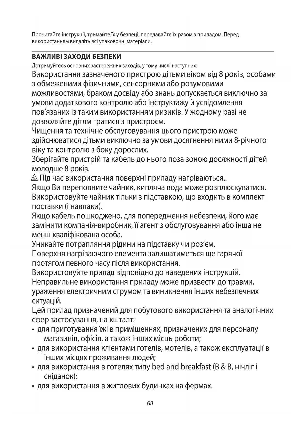 AE68 Прочитайте інструкції, тримайте їх у безпеці, передавайте їх разом з приладом. Перед використанням видаліть всі упаковочні матеріали. ВАЖЛИВІ ЗАХОДИ БЕЗПЕКИ Дотримуйтесь основних застережних заходів, у тому числі наступних: Використання зазначеного пристрою дітьми віком від 8 років, особами з обмеженими фізичними, сенсорними або розумовими можливостями, браком досвіду або знань допускається виключно за умови додаткового контролю або інструктажу й усвідомлення пов’язаних із таким використанням ризиків. У жодному разі не дозволяйте дітям гратися з пристроєм. Чищення та технічне обслуговування цього пристрою може здійснюватися дітьми виключно за умови досягнення ними 8-річного віку та контролю з боку дорослих. Зберігайте пристрій та кабель до нього поза зоною досяжності дітей молодше 8 років. h Під час використання поверхні приладу нагріваються.. Якщо Ви переповните чайник, кипляча вода може розплюскуватися. Використовуйте чайник тільки з підставкою, що входить в комплект поставки (і навпаки). Якщо кабель пошкоджено, для попередження небезпеки, його має замінити компанія-виробник, її агент з обслуговування або інша не менш кваліфікована особа. Уникайте потрапляння рідини на підставку чи роз’єм. Поверхня нагріваючого елемента залишатиметься ще гарячої протягом певного часу після використання. Використовуйте прилад відповідно до наведених інструкцій. Неправильне використання приладу може призвести до травми, ураження електричним струмом та виникнення інших небезпечних