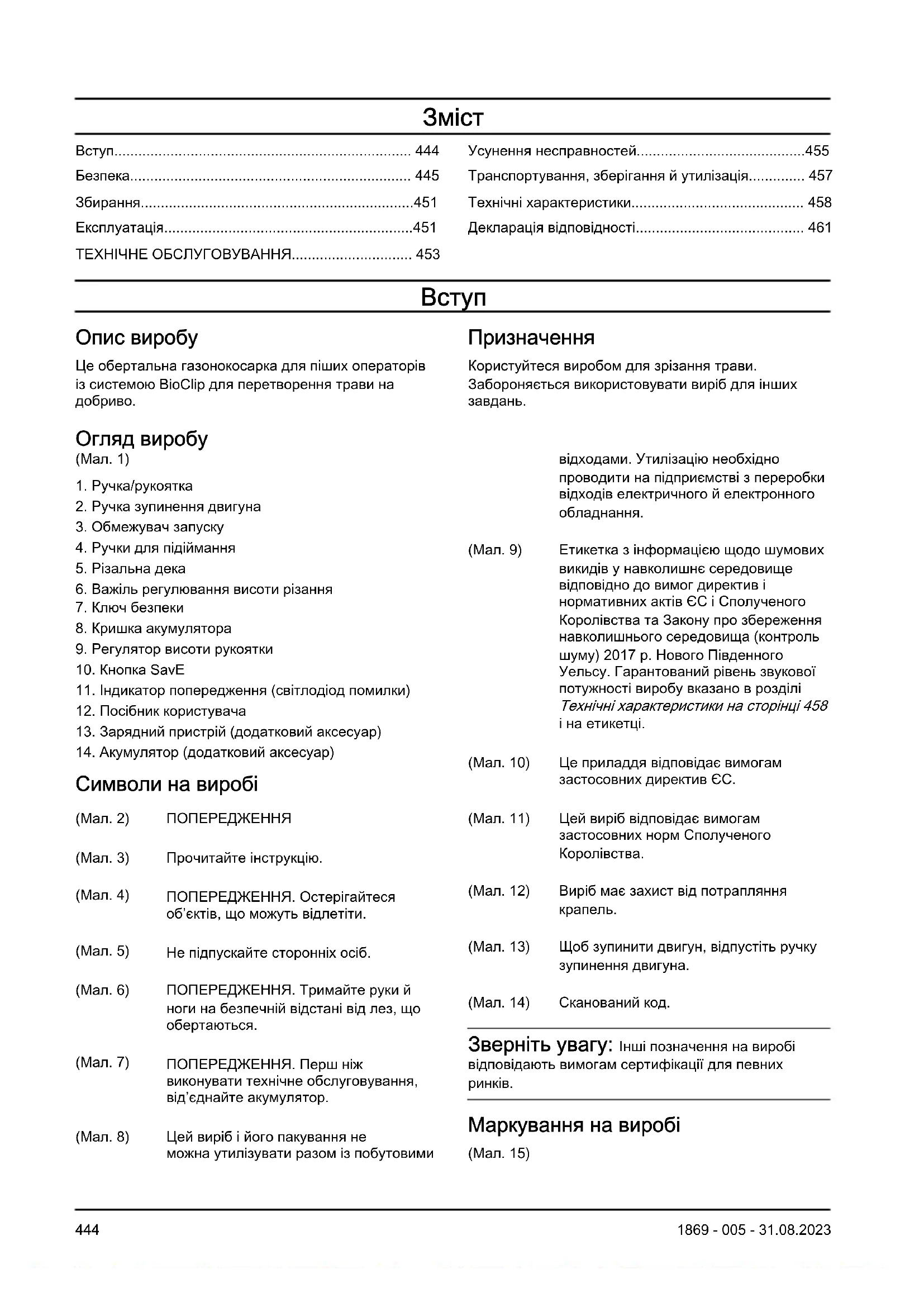Символи на виробі (Мал. 2) ПОПЕРЕДЖЕННЯ (Мал. 3) Прочитайте інструкцію. (Мал. 4) ПОПЕРЕДЖЕННЯ. Остерігайтеся об’єктів, що можуть відлетіти. (Мал. 5) Не підпускайте сторонніх осіб. (Мал. 6) ПОПЕРЕДЖЕННЯ. Тримайте руки й ноги на безпечній відстані від лез, що обертаються. (Мал. 7) ПОПЕРЕДЖЕННЯ. Перш ніж виконувати технічне обслуговування, від’єднайте акумулятор. (Мал. 8) Цей виріб і його пакування не можна утилізувати разом із побутовими відходами. Утилізацію необхідно проводити на підприємстві з переробки відходів електричного й електронного обладнання. (Мал. 9) Етикетка з інформацією щодо шумових викидів у навколишнє середовище відповідно до вимог директив і нормативних актів ЄС і Сполученого Королівства та Закону про збереження навколишнього середовища (контроль шуму) 2017р. Нового Південного Уельсу. Гарантований рівень звукової потужності виробу вказано в розділі Технічні характеристики на сторінці 458 і на етикетці. (Мал. 10) Це приладдя відповідає вимогам застосовних директив ЄС. (Мал. 11) Цей виріб відповідає вимогам застосовних норм Сполученого Королівства. (Мал. 12) Виріб має захист від потрапляння