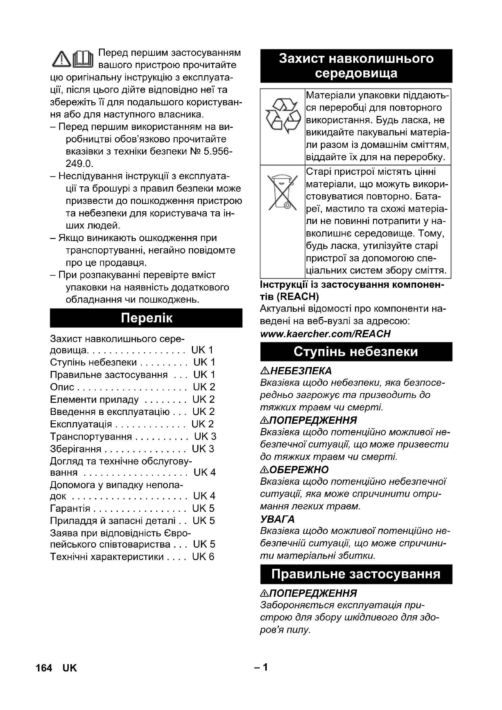 Матеріали упаковки піддають- ся переробці для повторного використання. Будь ласка, не викидайте пакувальні матеріа- ли разом із домашнім сміттям, віддайте їх для на переробку. Старі пристрої містять цінні матеріали, що можуть викори- стовуватися повторно. Бата- реї, мастило та схожі матеріа- ли не повинні потрапити у на- вколишнє середовище. Тому, будь ласка, утилізуйте старі пристрої за допомогою спе- ціальних систем збору сміття. Ступінь небезпеки Правильне застосування 164 UK– 2 – Цей пилосос спеціально призначе- ний для використання в пекарнях і для очищення печей. – Цей пристрій призначено для проми- слового використання. – Пристрій постачається приладдя. – Додаткові комплекти аксесуарів, що поставляються як опція, спеціально розроблені для використання в пе- карнях, див. «Приладдя та запасні
