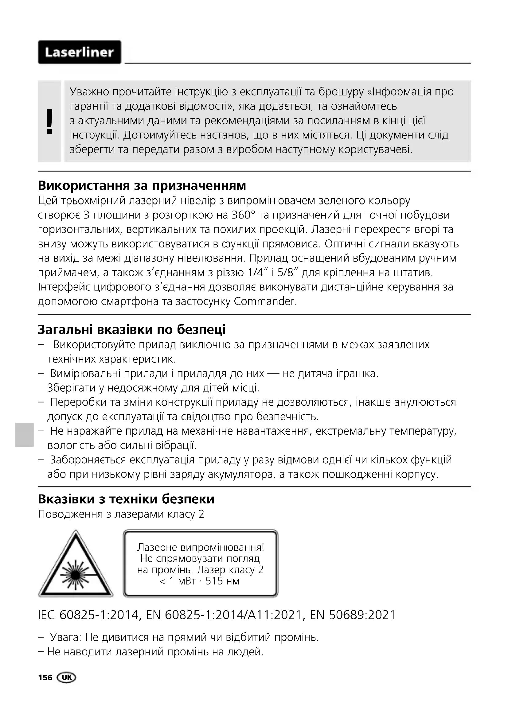 Використання за призначенням Цей трьохмірний лазерний нівелір з випромінювачем зеленого кольору створює 3площини з розгорткою на 360° та призначений для точної побудови горизонтальних, вертикальних та похилих проекцій. Лазерні перехрестя вгорі та внизу можуть використовуватися в функції прямовиса. Оптичні сигнали вказують на вихід за межі діапазону нівелювання. Прилад оснащений вбудованим ручним приймачем, а також з’єднанням з різзю 1/4“ і 5/8“ для кріплення на штатив. Інтерфейс цифрового з’єднання дозволяє виконувати дистанційне керування за допомогою смартфона та застосунку Commander. Загальні вказівки по безпеці – Використовуйте прилад виключно за призначеннями в межах заявлених технічних характеристик. – Вимірювальні прилади і приладдя до них — не дитяча іграшка. Зберігати у недосяжному для дітей місці. – Переробки та зміни конструкції приладу не дозволяються, інакше анулюються допуск до експлуатації та свідоцтво про безпечність. – Не наражайте прилад на механічне навантаження, екстремальну температуру, вологість або сильні вібрації. – Забороняється експлуатація приладу у разу відмови однієї чи кількох функцій або при низькому рівні заряду акумулятора, а також пошкодженні корпусу. Вказівки з техніки безпеки Поводження з лазерами класу 2 – Увага: Не дивитися на прямий чи відбитий промінь. – Не наводити лазерний промінь на людей.