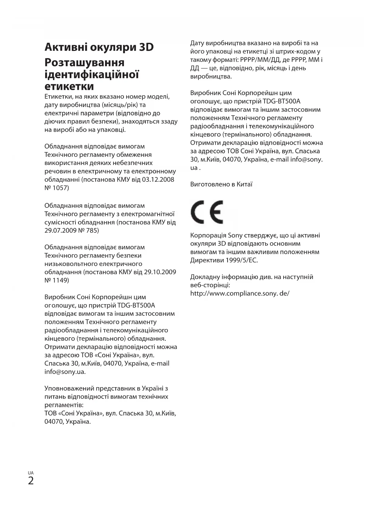 олошує, що пристрій TDG-BT500A відповідає вимогам та іншим застосовним положенням Технічного регламенту радіообладнання і телекомунікаційного кінцевого (термінального) обладнання. Отримати декларацію відповідності можна за адресою ТОВ «Соні Україна», вул. Спаська 30, м.Київ, 04070, Україна, e-mail info@sony.ua. Уповноважений представник в Україні з питань відповідності вимогам технічних регламентів: ТОВ «Соні Україна», вул. Спаська 30, м.Київ, 04070, Україна. Дату виробництва вказано на виробі та на його упаковці на етикетці зі штрих-кодом у такому форматі: РРРР/ММ/ДД, де РРРР, ММ і ДД — це, відповідно, рік, місяць і день виробництва. Виробник Соні Корпорейшн цим оголошує, що пристрій TDG-BT500A відповідає вимогам та іншим застосовним положенням Технічного регламенту радіообладнання і телекомунікаційного кінцевого (термінального) обладнання. Отримати декларацію відповідності можна за адресою ТОВ Соні Україна, вул. Спаська 30, м.Київ, 04070, Україна, e-mail info@sony. ua . Виготовлено в Китаї Корпорація Sony стверджує, що ці активні окуляри 3D відповідають основним вимогам та іншим важливим положенням Директиви 1999/5/EC. Докладну інформацію див. на наступній веб-сторінці: http://www.compliance.sony. de/3