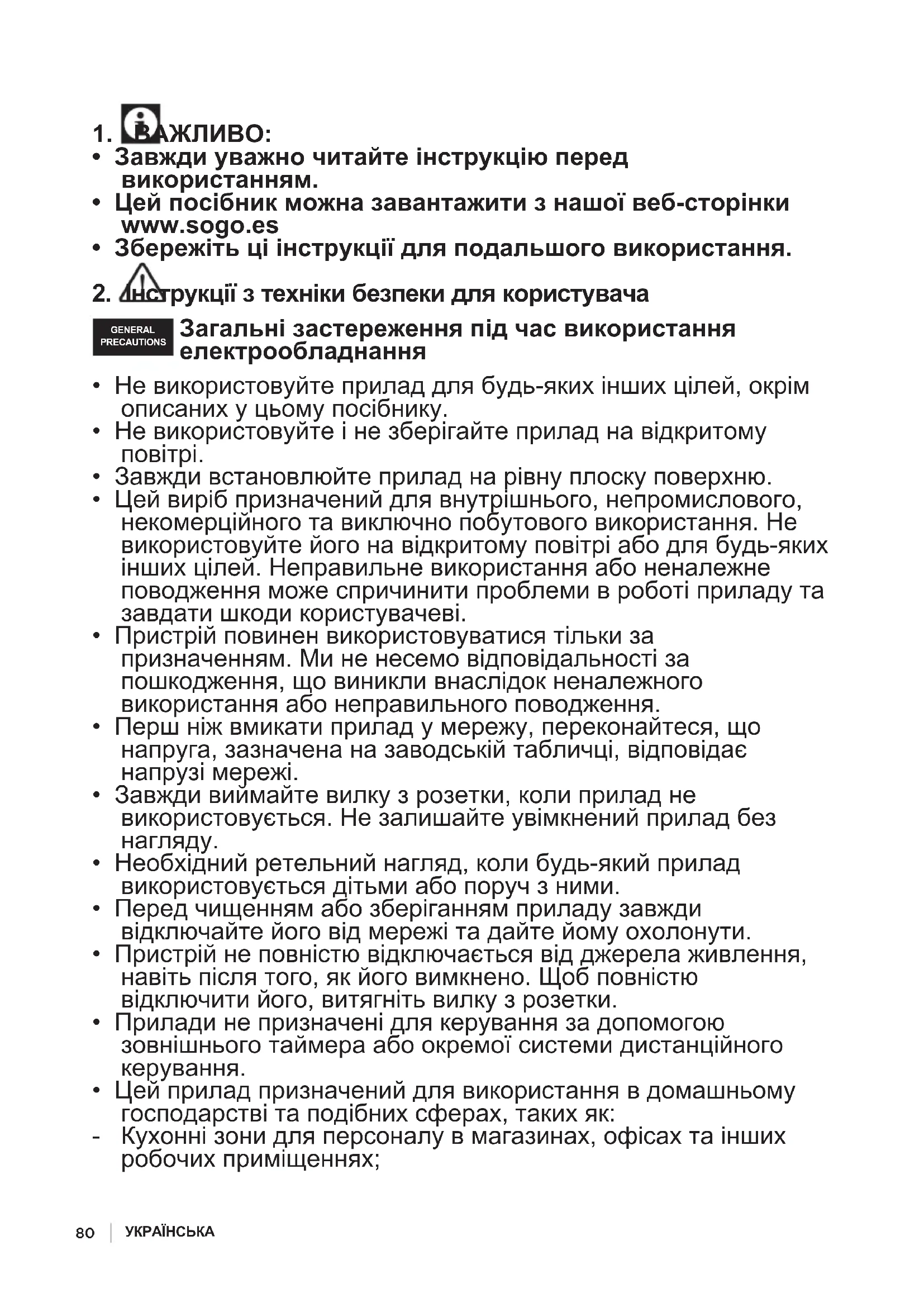- ПОПЕРЕДЖЕННЯ: Цей прилад слід використовувати з ОБЕРЕЖНІСТЮ, оскільки він містить функцію нагрівання. Поверхня цього приладу також відрізняється від інших функціональних поверхонь, які можуть виробляти високу температуру. Оскільки різні люди по-різному сприймають температуру. До приладу можна торкатися лише за передбачені для цього ручки та поверхні для захоплення за допомогою теплозахисних засобів, наприклад, рукавичок або подібного одягу. В іншому випадку, перш ніж торкатися гарячих поверхонь, дайте приладу охолонути протягом достатнього періоду часу. ПРИБИРАННЯ ТА ОБСЛУГОВУВАННЯ Будь ласка, зверніться до розділу “Чистка та обслуговування” для отримання детальної інформації про те, як чистити поверхні, що контактують з продуктами харчування.85