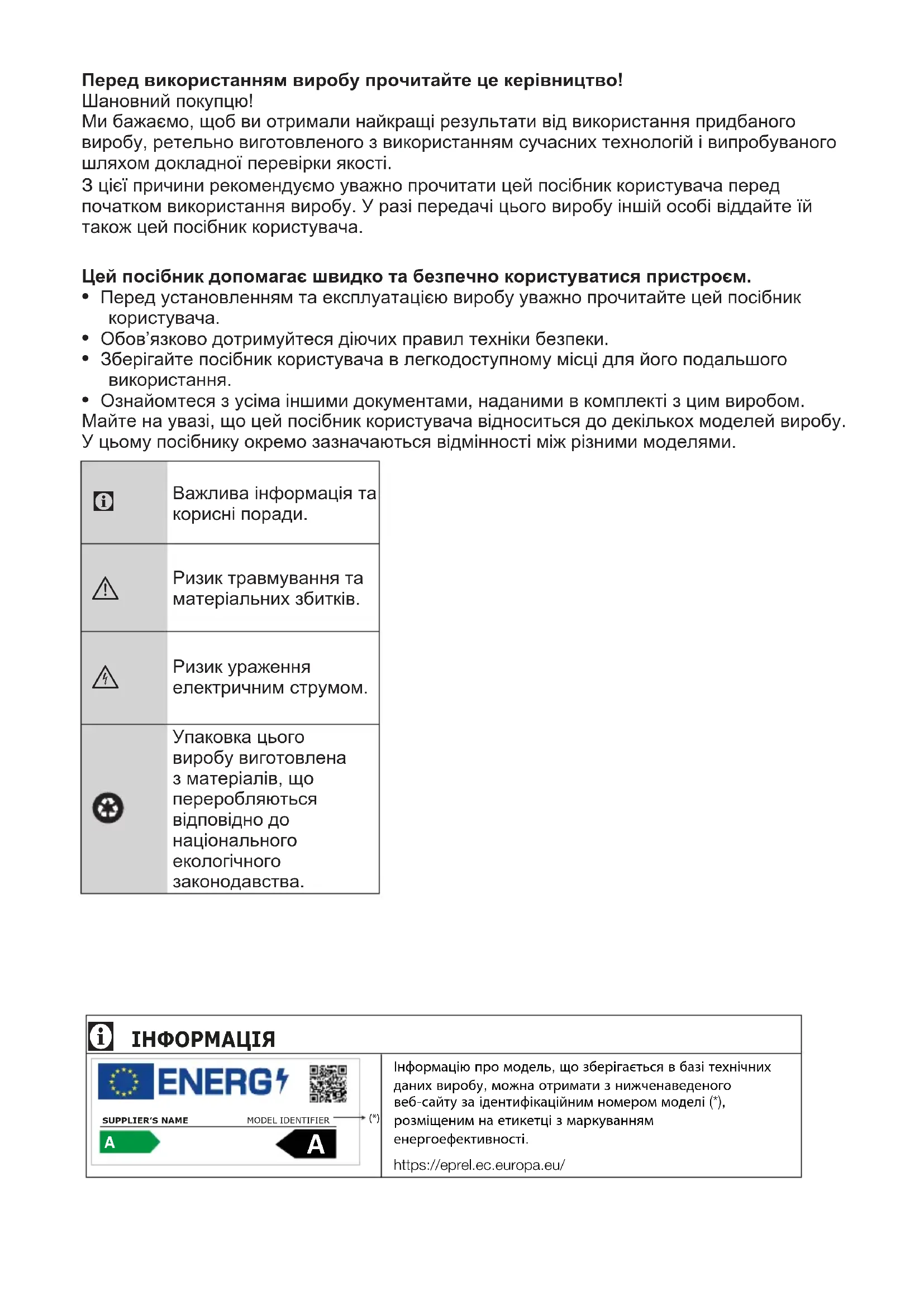 - Ознайомтеся з усіма іншими документами, наданими в комплекті з цим виробом. Майте на увазі, що цей посібник користувача відноситься до декількох моделей виробу. У цьому посібнику окремо зазначаються відмінності між різними моделями. Важлива інформація та корисні поради. Ризик травмування та матеріальних збитків. Ризик ураження електричним струмом. Упаковка цього виробу виготовлена з матеріалів, що переробляються відповідно до національного екологічного законодавства.