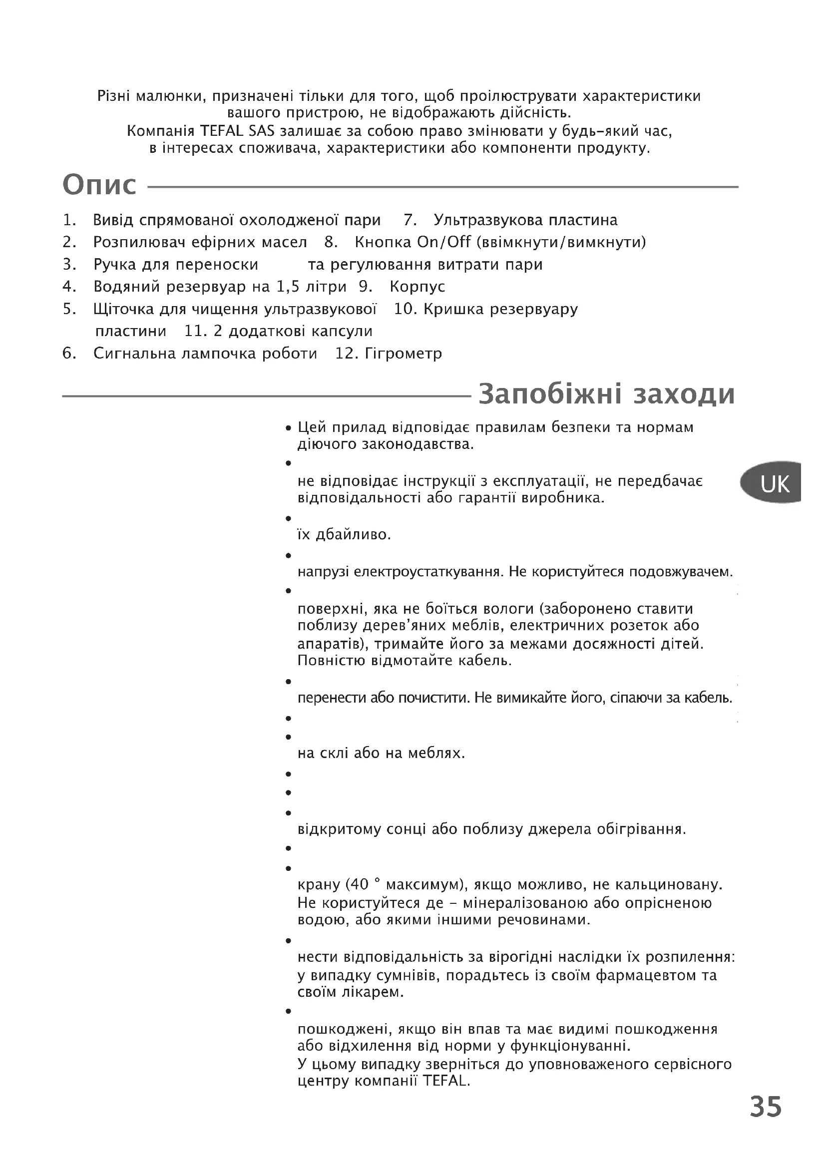 - Компанія Tefal не гарантує якості розпилених запахів і не може нести відповідальність за вірогідні наслідки їх розпилення: у випадку сумнівів, порадьтесь із своїм фармацевтом та своїм лікарем.