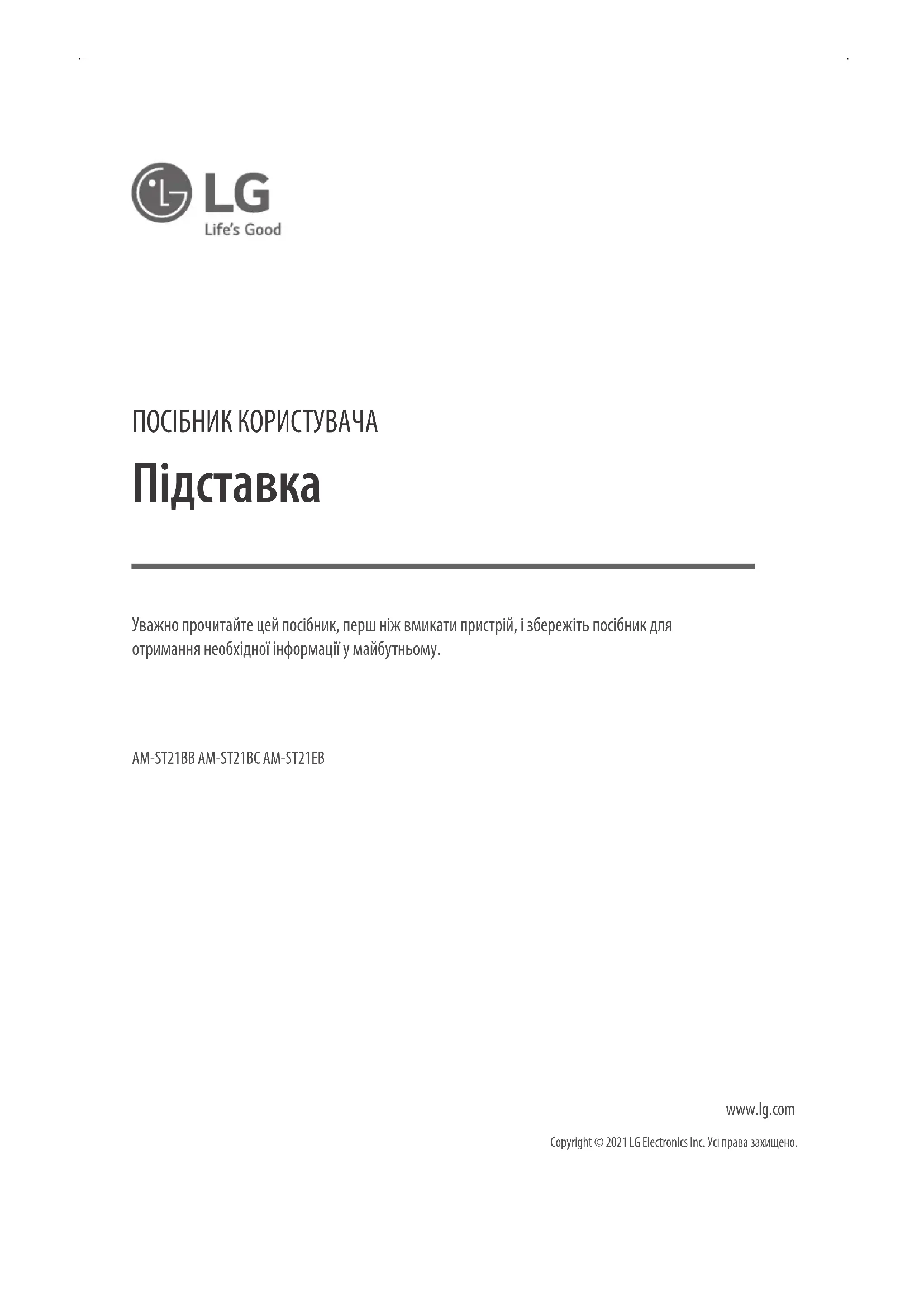 www.lg.com Copyright © 2021 LG Electronics Inc. Усі права захищено. Уважно прочитайте цей посібник, перш ніж вмикати пристрій, і збережіть посібник для отримання необхідної інформації у майбутньому. AM-ST21BB AM-ST21BC AM-ST21EB2